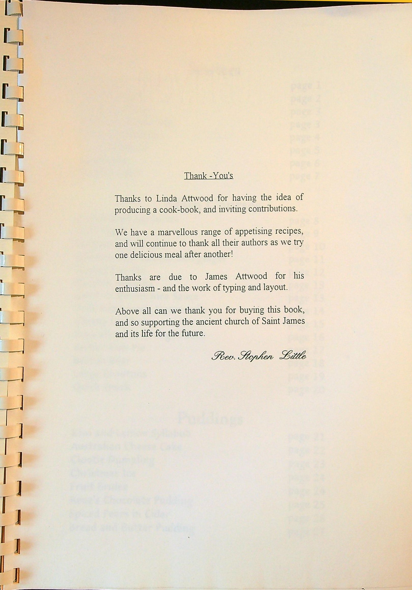 This recipe book was produced in 1995 to raise funds for St James' Church. The main organisers were Linda Attwood and James Attwood, mother and son. One of quaint aspects is the names of those who contributed the recipes, some of whom have sadly passed away. Julian Rawes, Harvington 2025. |