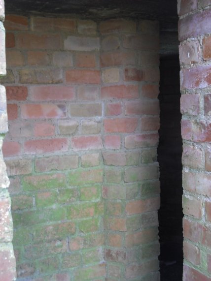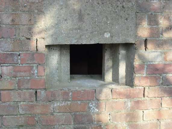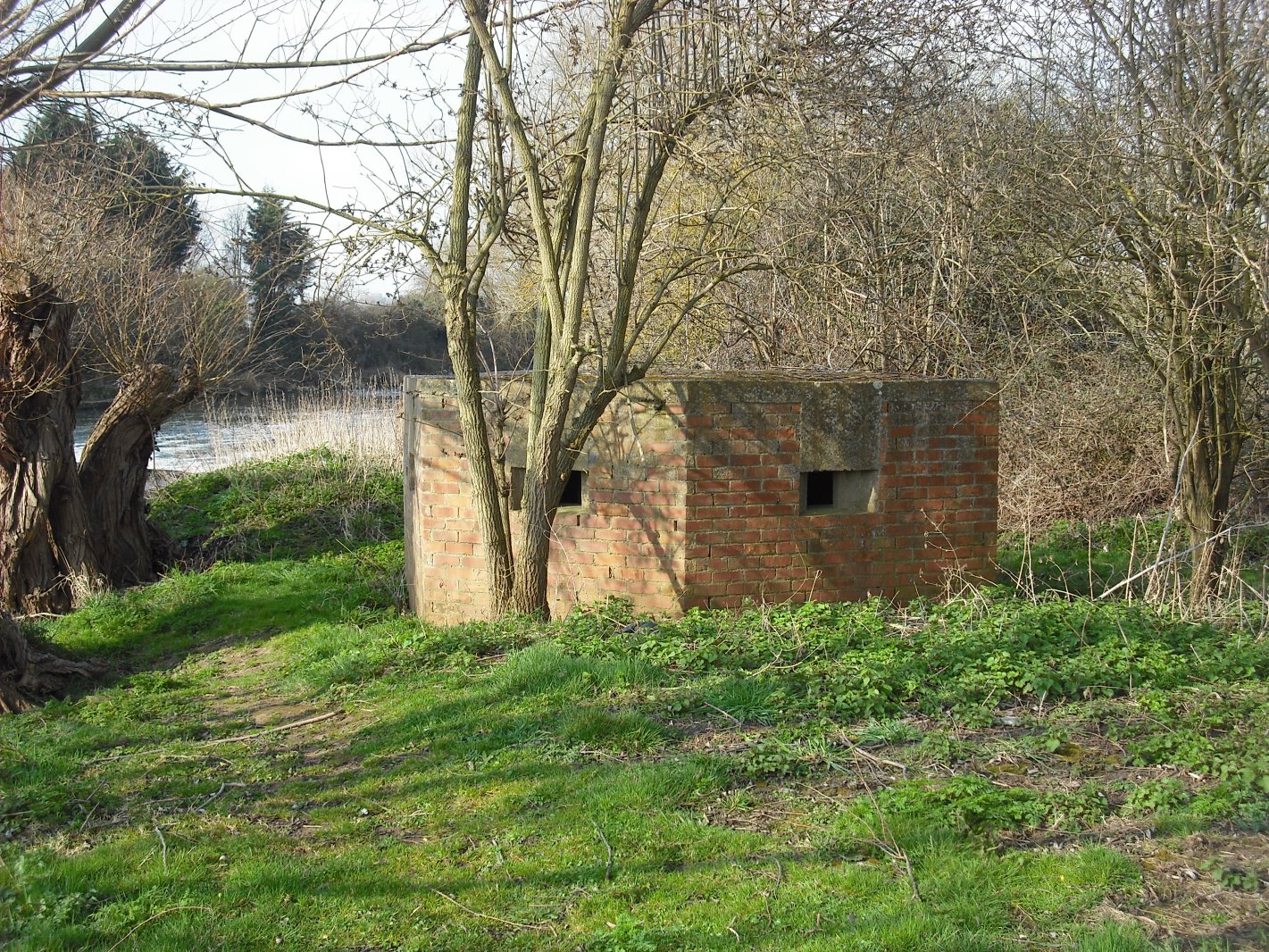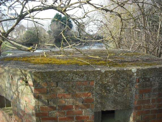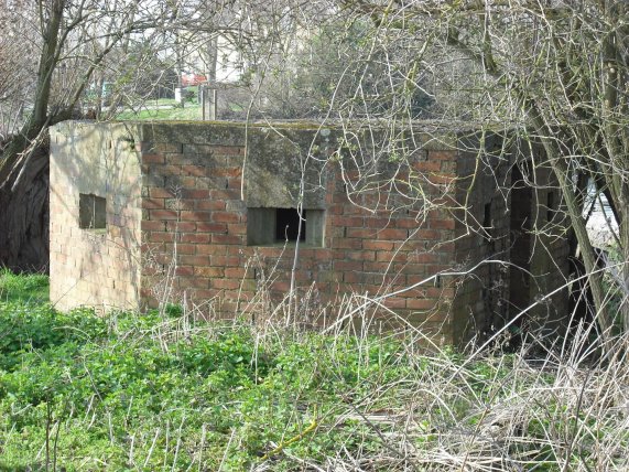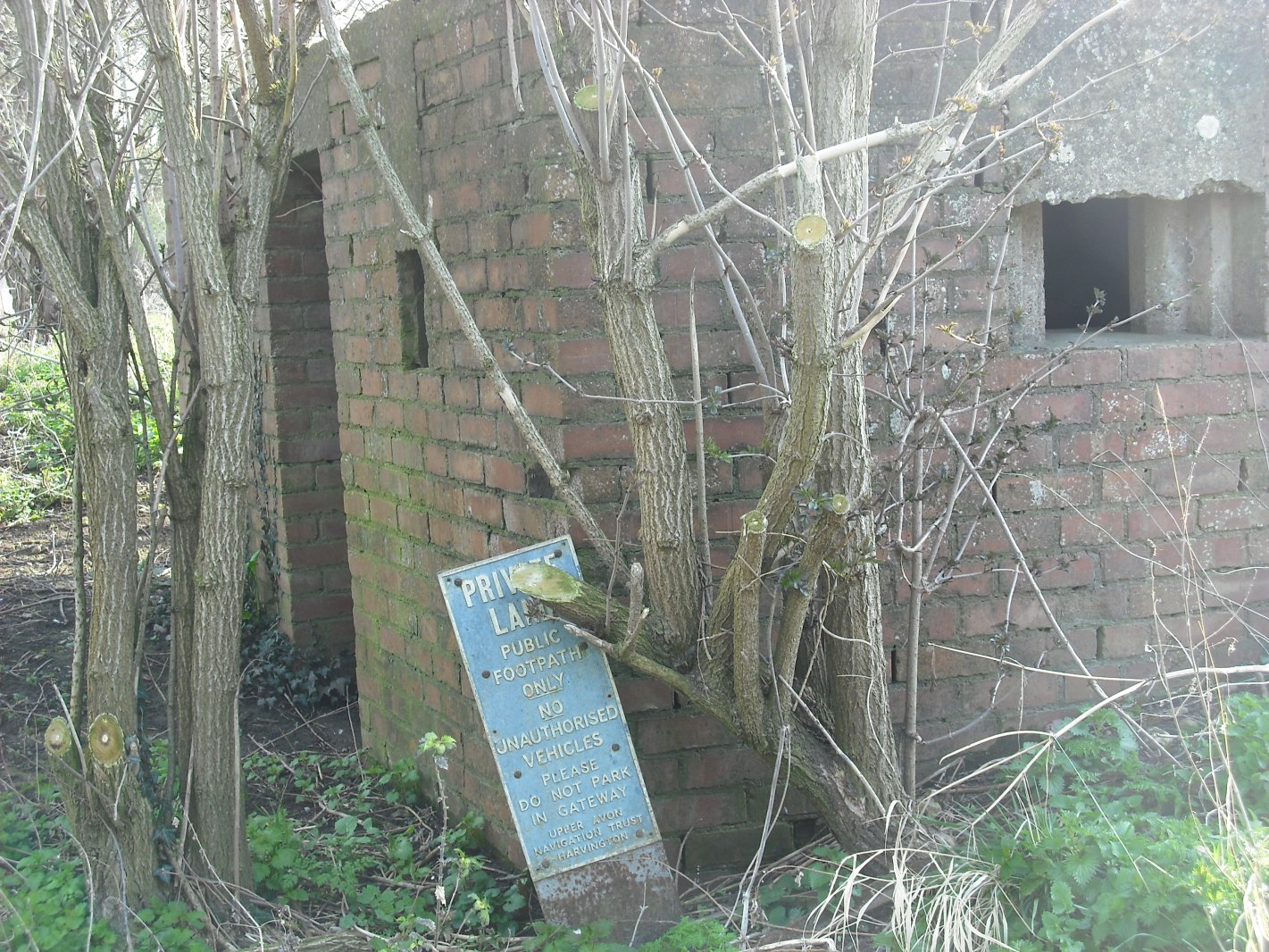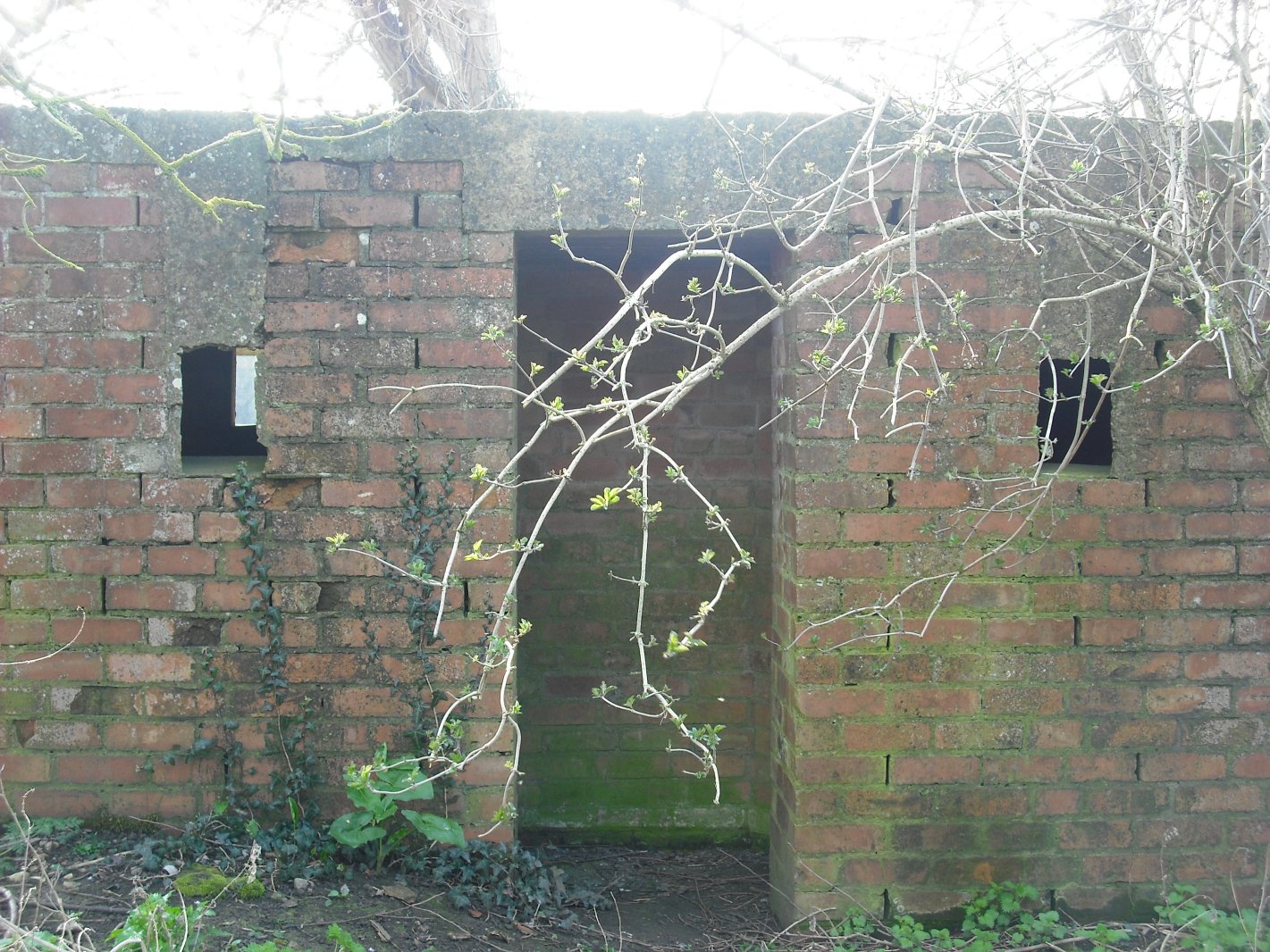 Harvington pill-box is down Anchor Lane near to the ford and weir on the river Avon. It is a well-built in an irregular hexagonal shaped style with the door side being the longest. It is in reasonably good condition, apart from needing a good tidy up. One of the photographs attempts to shew the interior. One can see a triangular brick pillar which was erected both to support the roof and angled to deflect gunfire. Following is a series of photographs taken in March 2015.