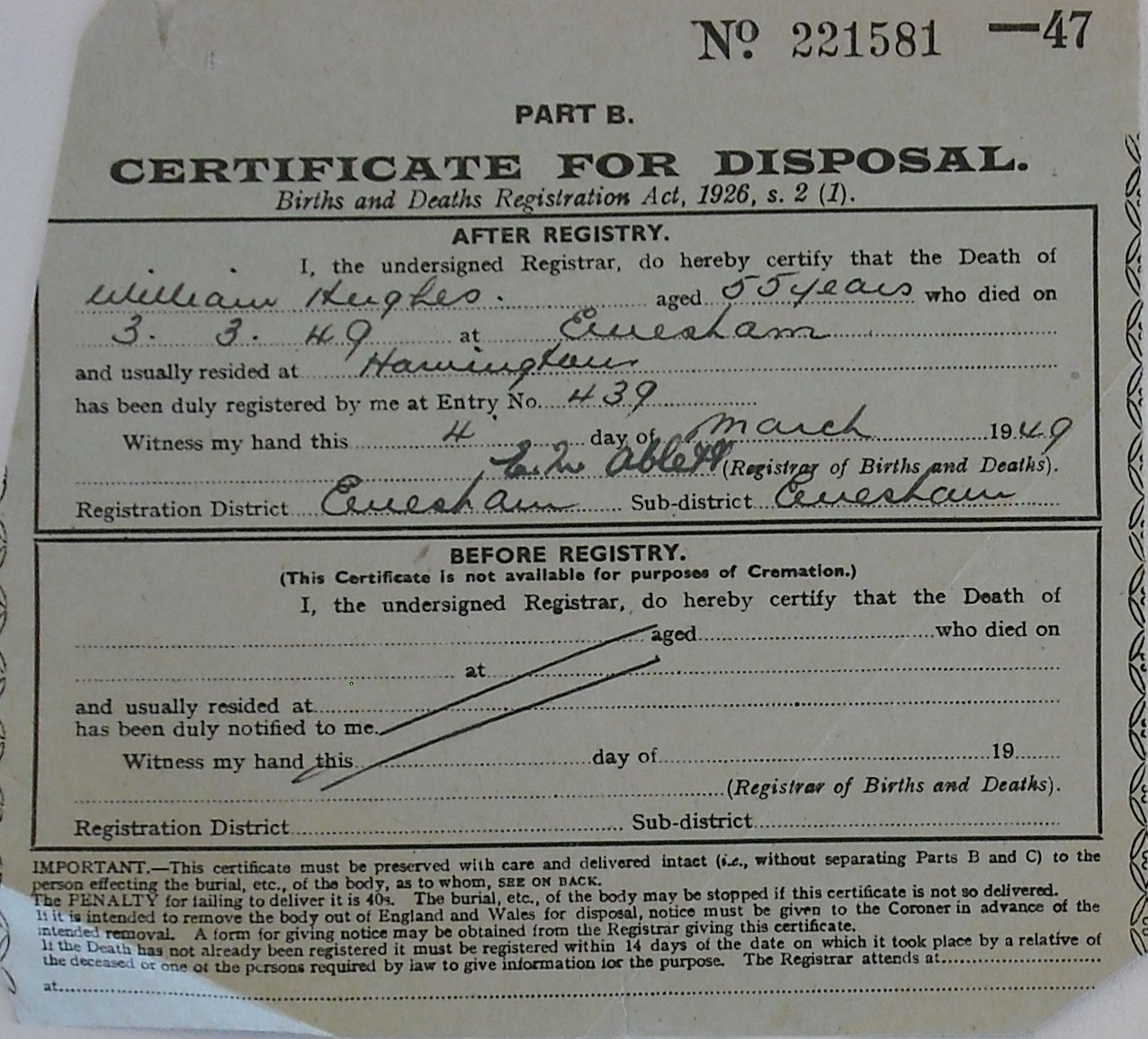 4 March 1949 William Hughes Plot 420 Burial Ground