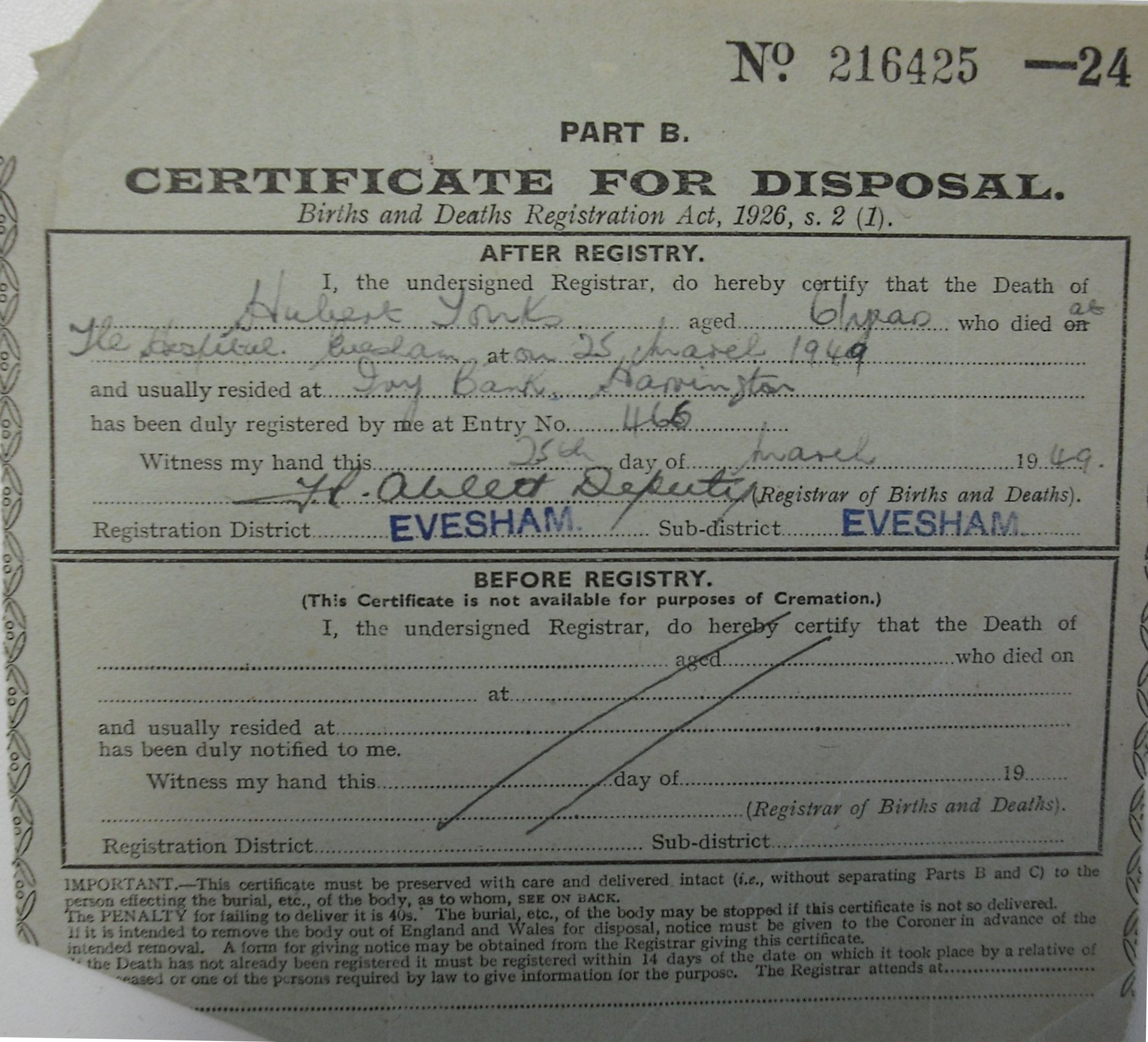 25 March 1949 Hubert Tonks Plot 546 Burial Ground