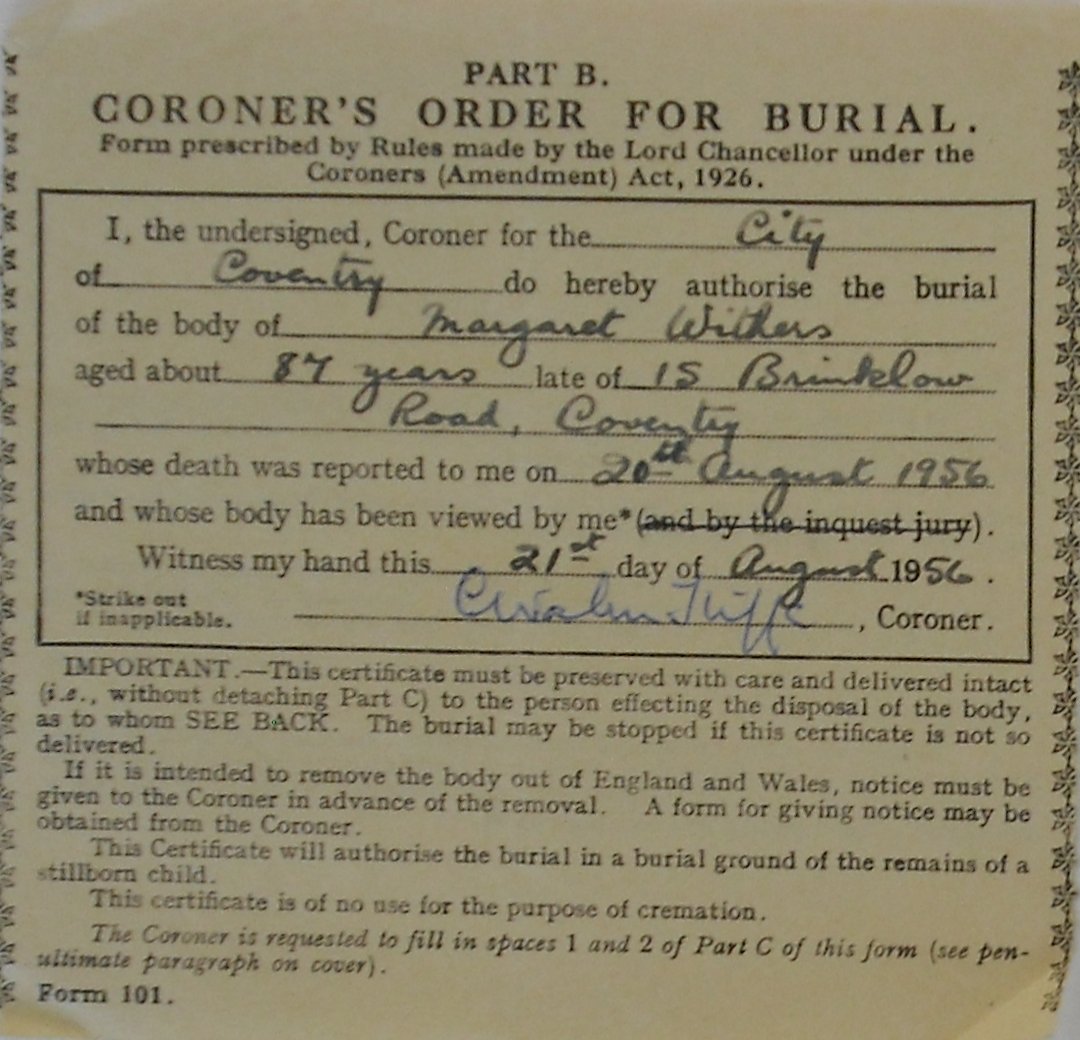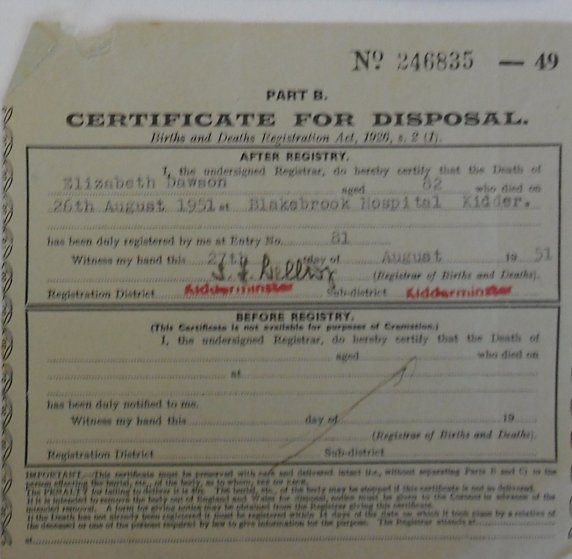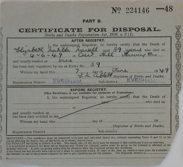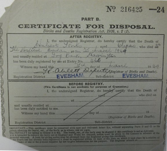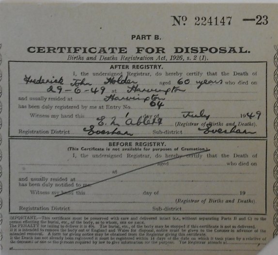 This is an incomplete list of the burial certificates available. The following certificates were photographed at Worcestershire Record Office while working on another project. There is also another batch of the certificates lodged at the church in Harvington. This webpage has been created to display what has been gathered so far with a date range of 1949 to 1956.