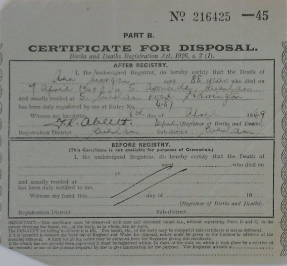 8 April 1949 Ann Morgan Plot 79 Burial Ground
