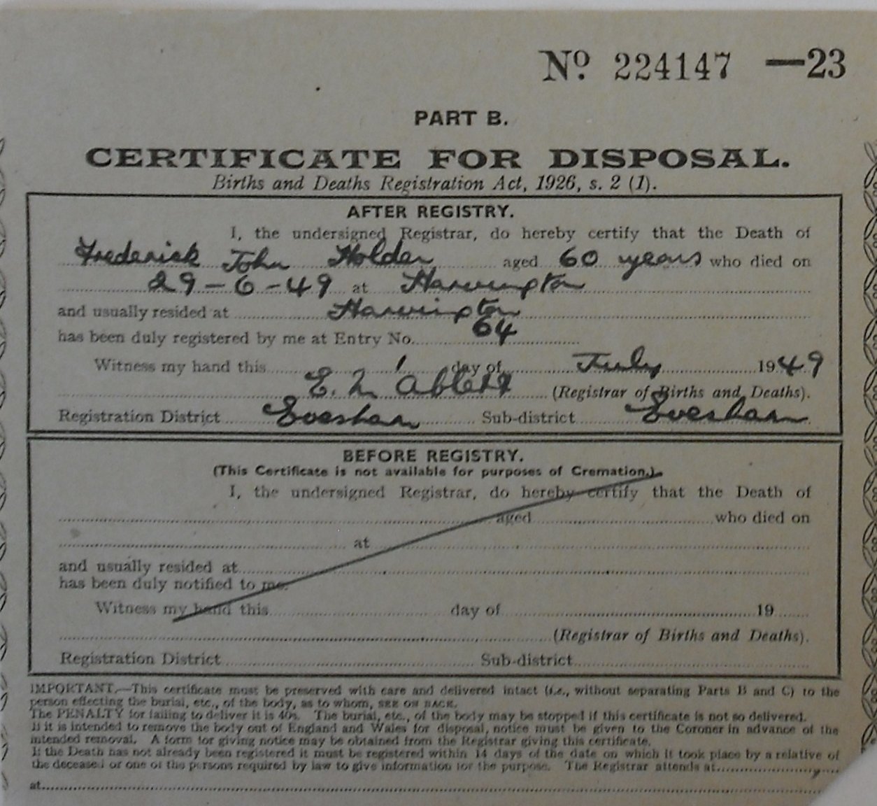 1 July 1949 Frederick John Holder Plot 84 Burial Ground