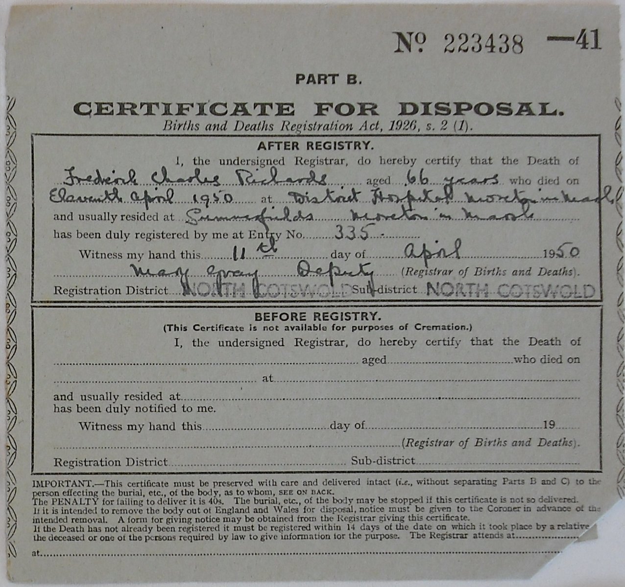 11 April 1950 Frederick Charles Richards Plot 56 Burial Ground