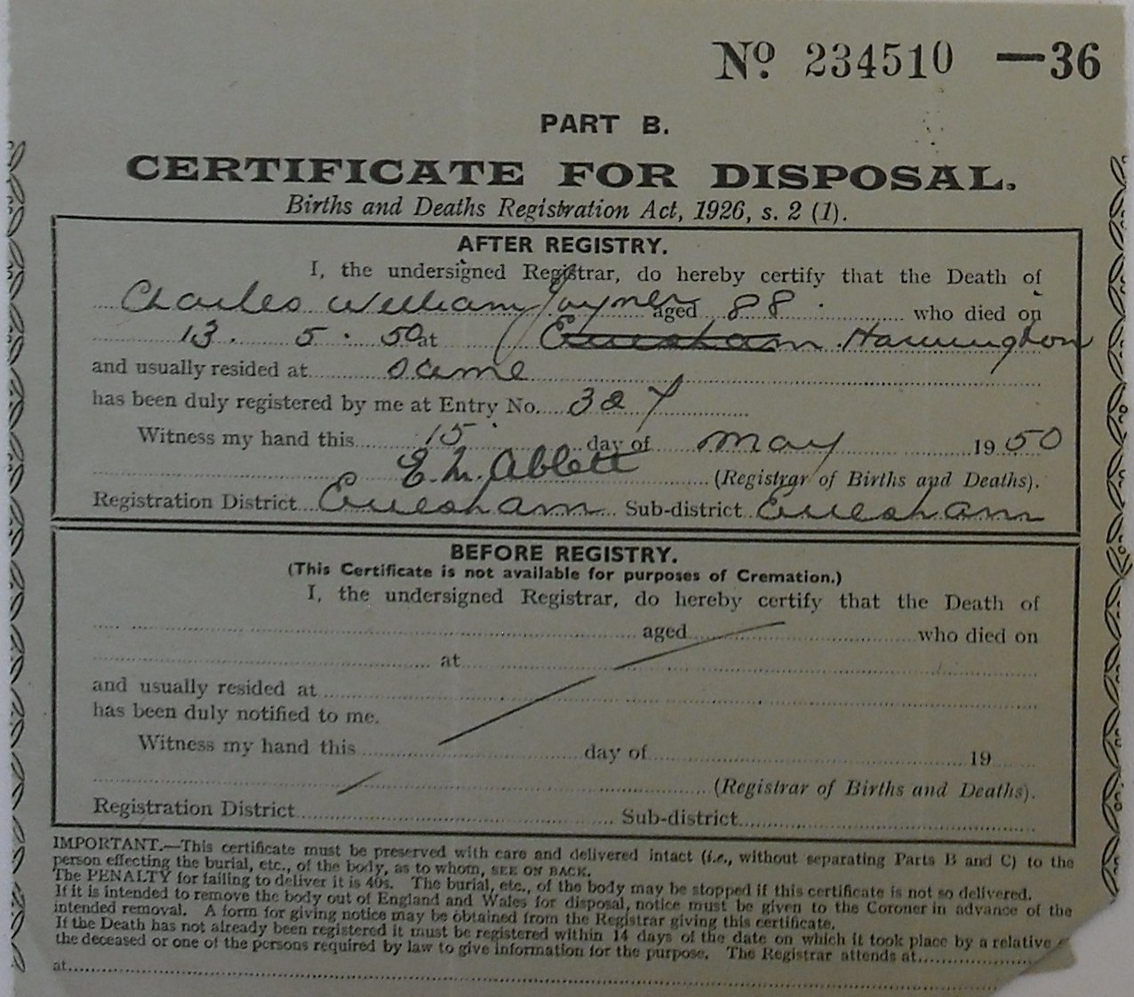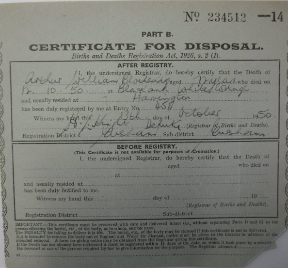 13 October 1950 Arthur William Blotheridge Plot 419 Burial Ground