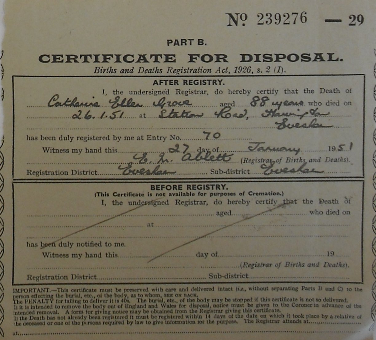 27 January 1951 Catherine Ellen Grove Plot 179 Burial Ground