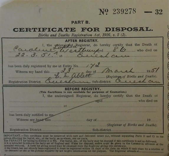 23 March 1951 Caroline Sophia Westbury Plot 38 Burial Ground