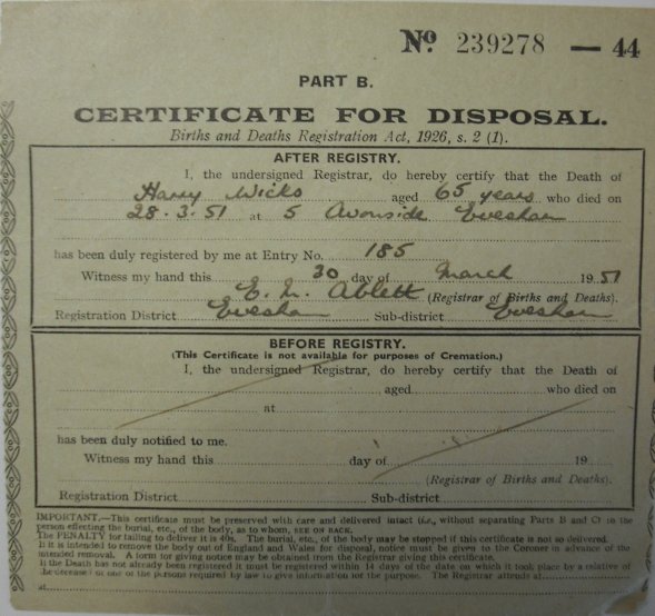 30 March 1951 Harry Wicks Plot 545 Burial Ground