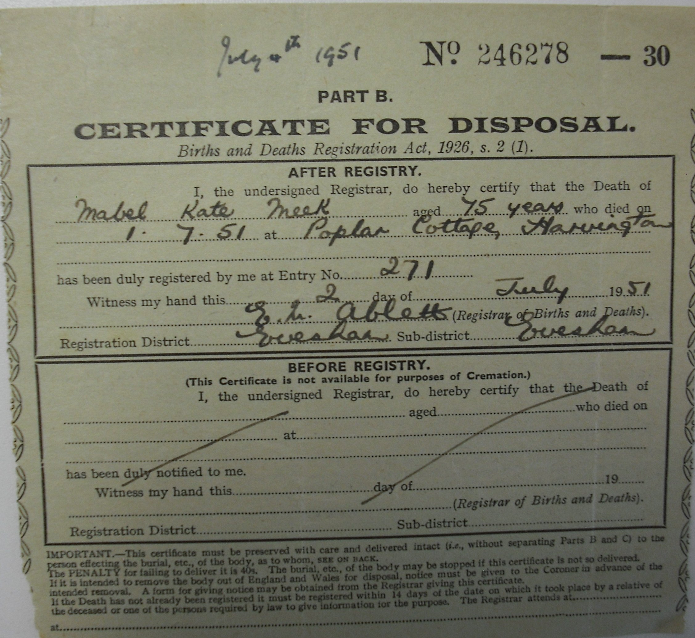2 July 1951 Mabel Kate Meek Plot 36 Burial Ground