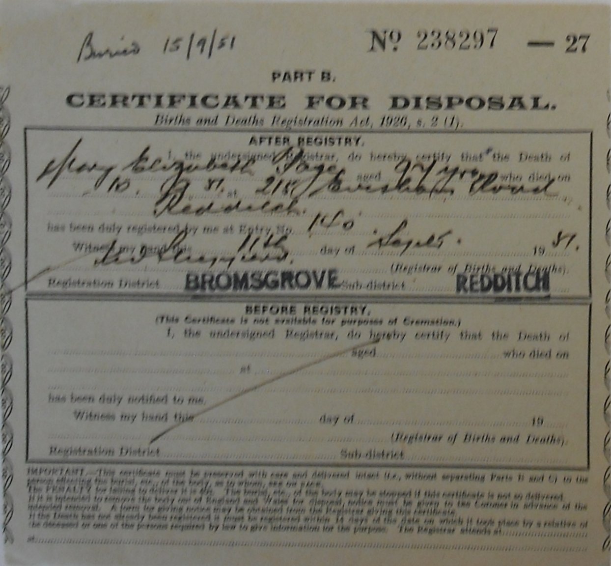 11 August 1951 Mary Elizabeth Page Plot 62/3 Burial Ground
