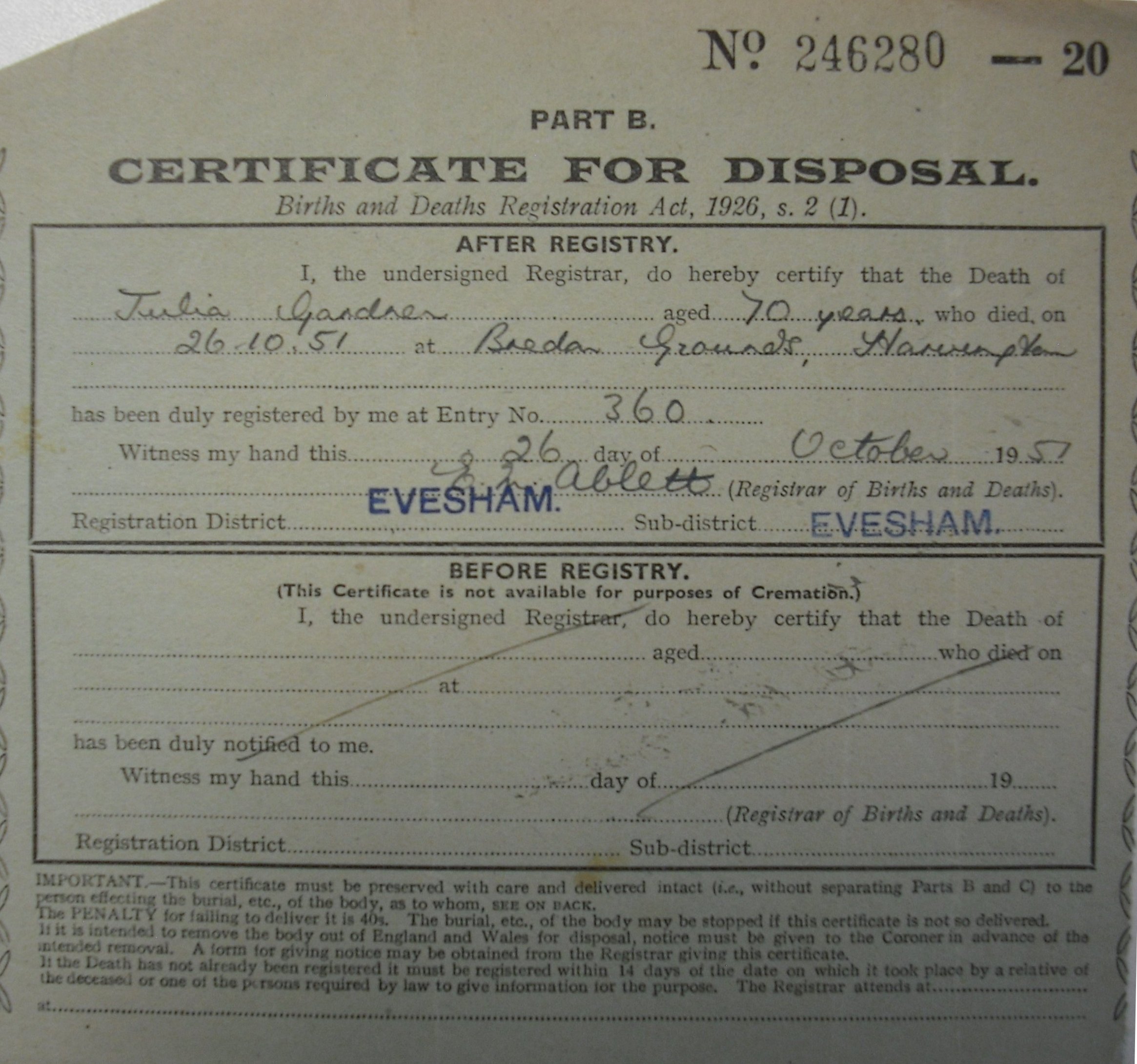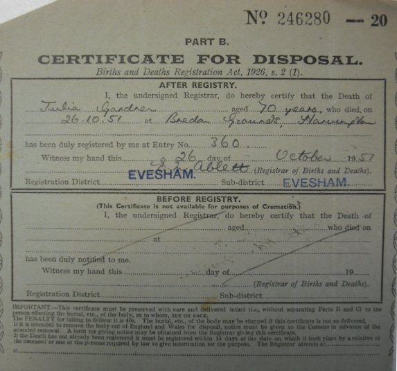 31 October 1951 Julia Gardner Plot 544 Burial Ground