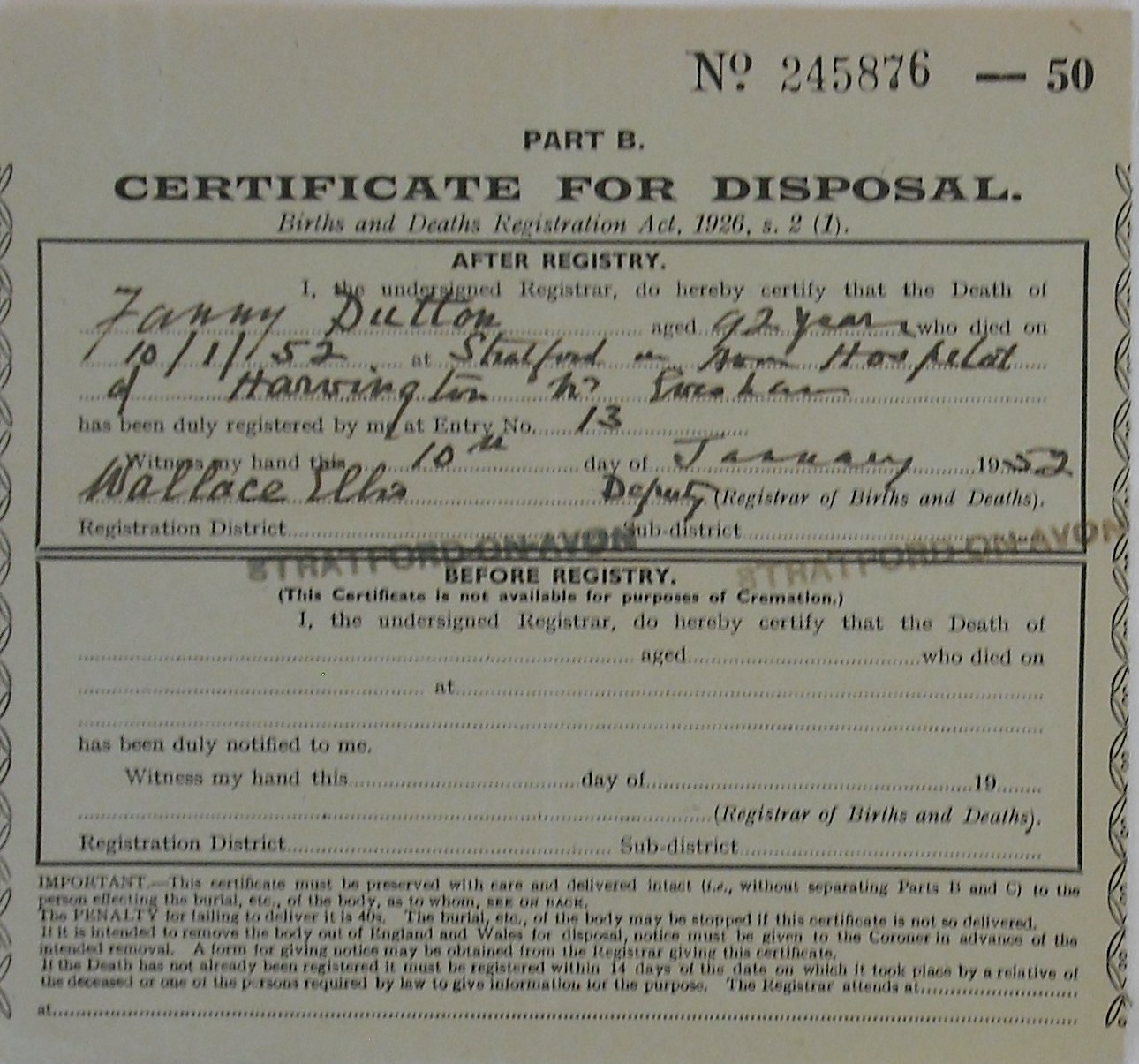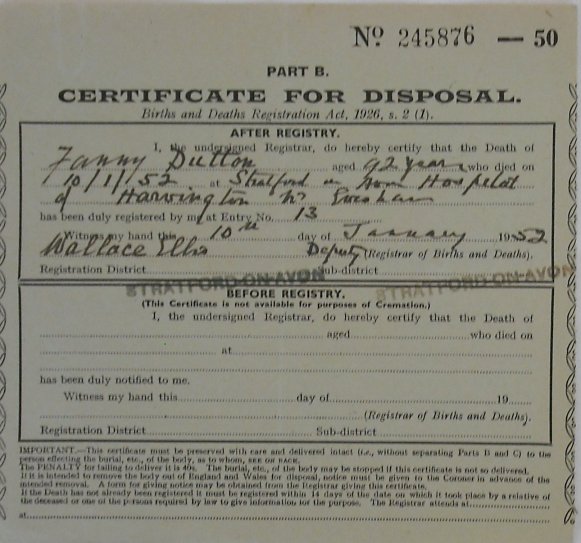 10 January 1952 Fanny Dutton Plot 87 Burial Ground