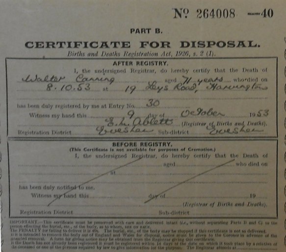 9 October 1953 Walter Canning Plot 29 Burial Ground