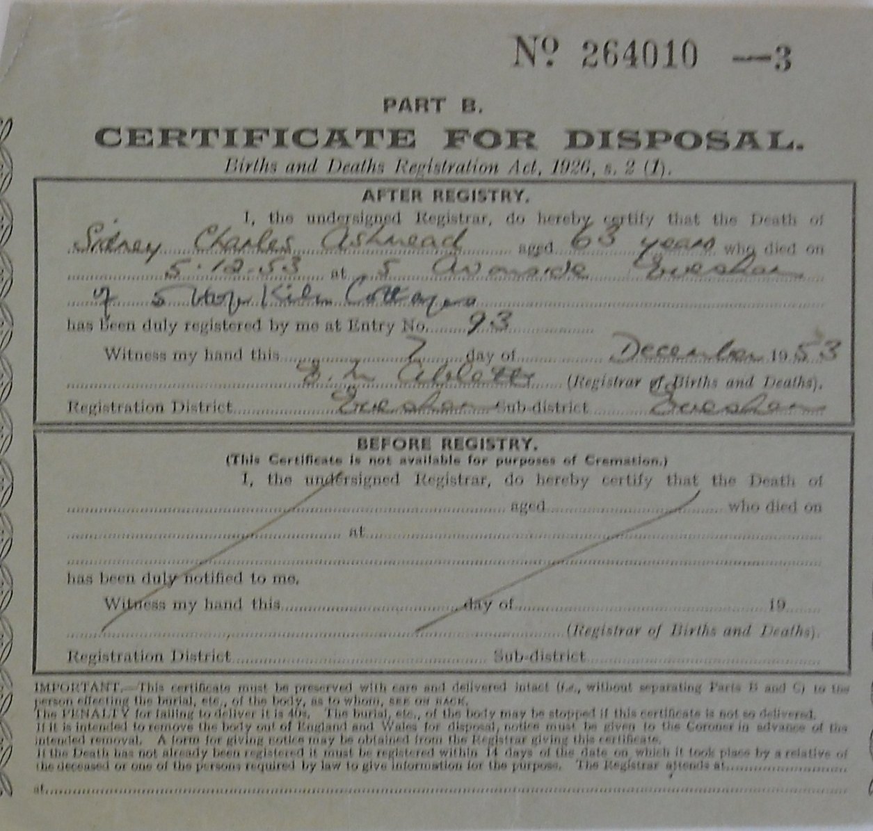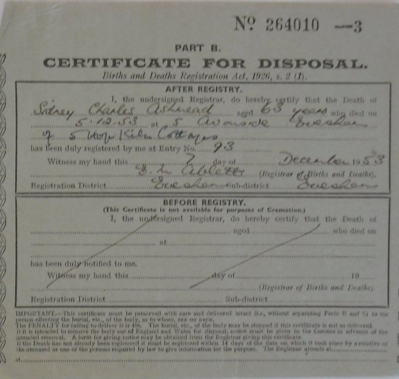 7 December 1953 Sidney Charles Ashmead Plot 214 Burial Ground