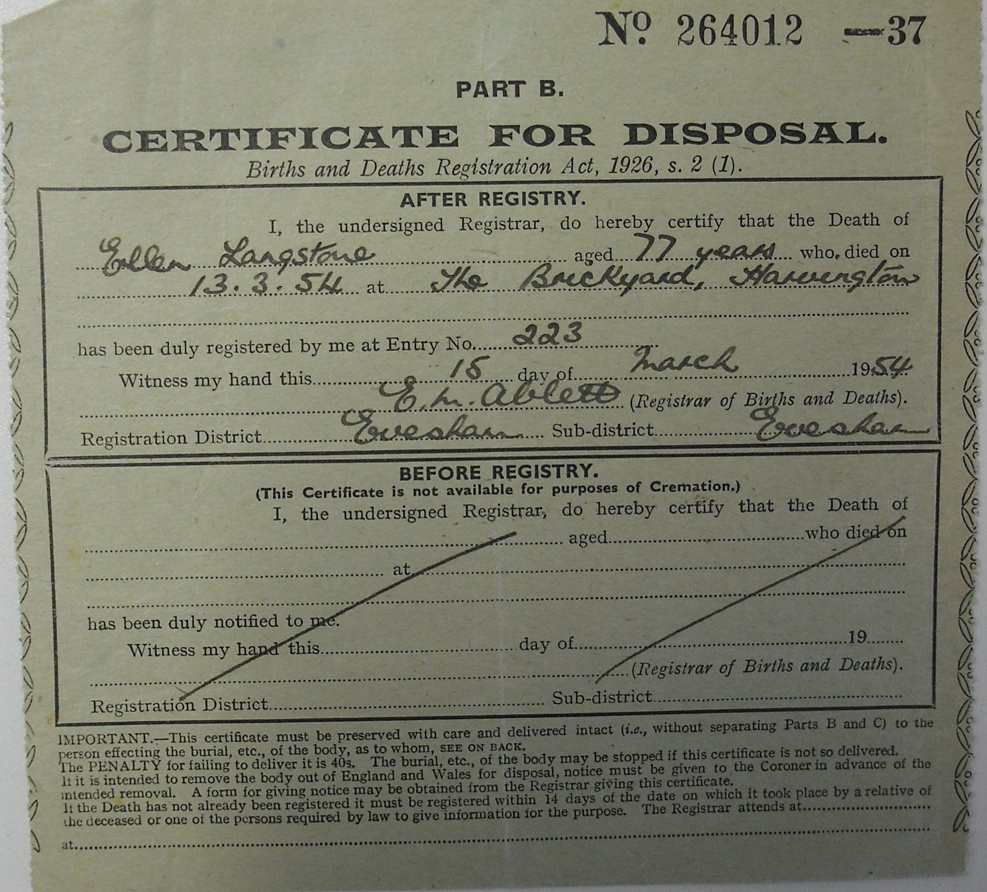 15 March 1954 Ellen Langstone Plot 417 Burial Ground