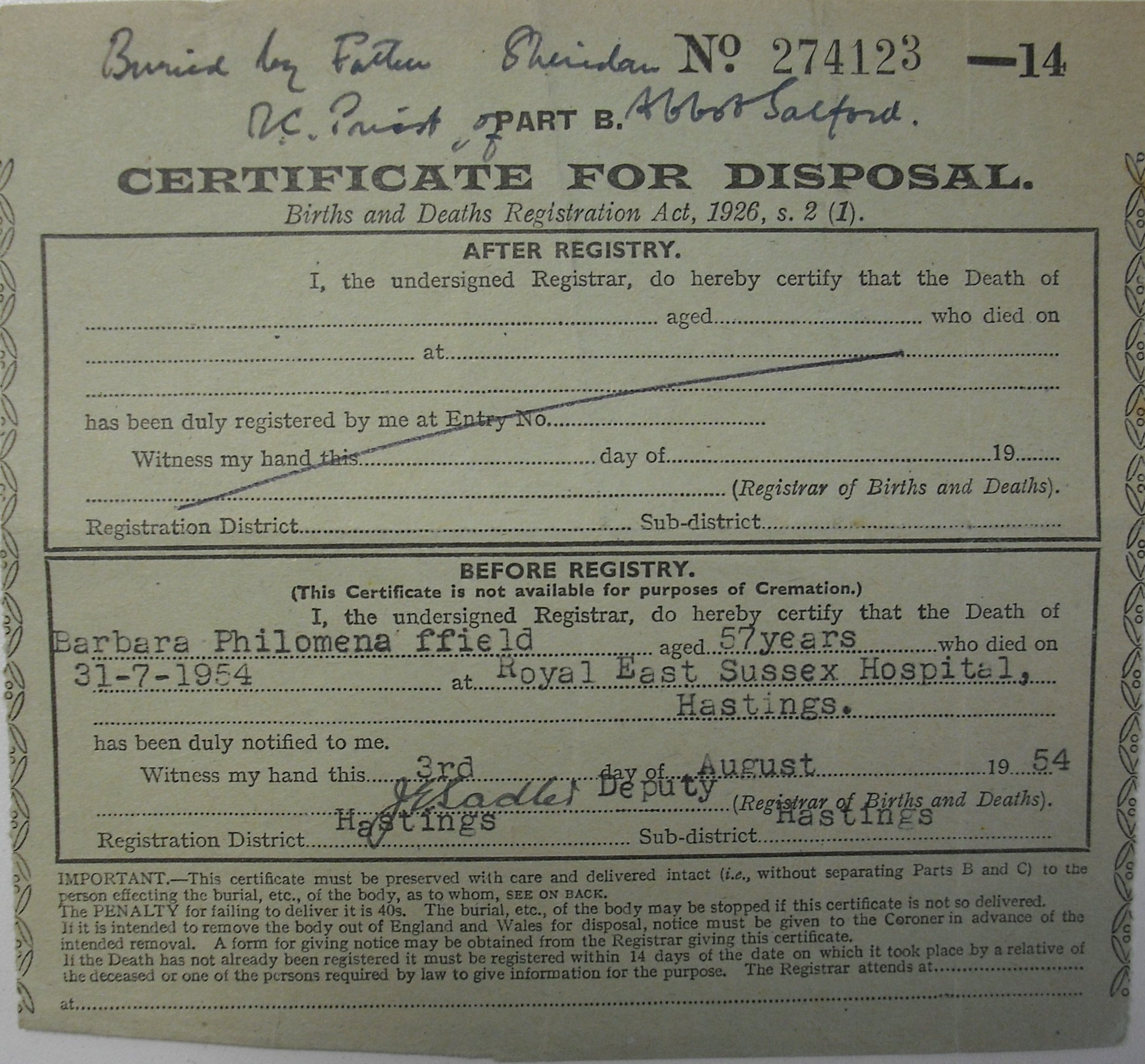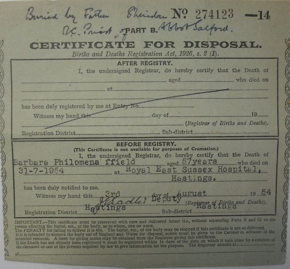 3 August 1954 Barbara Philomena Ffield Plot 462 Burial Ground
