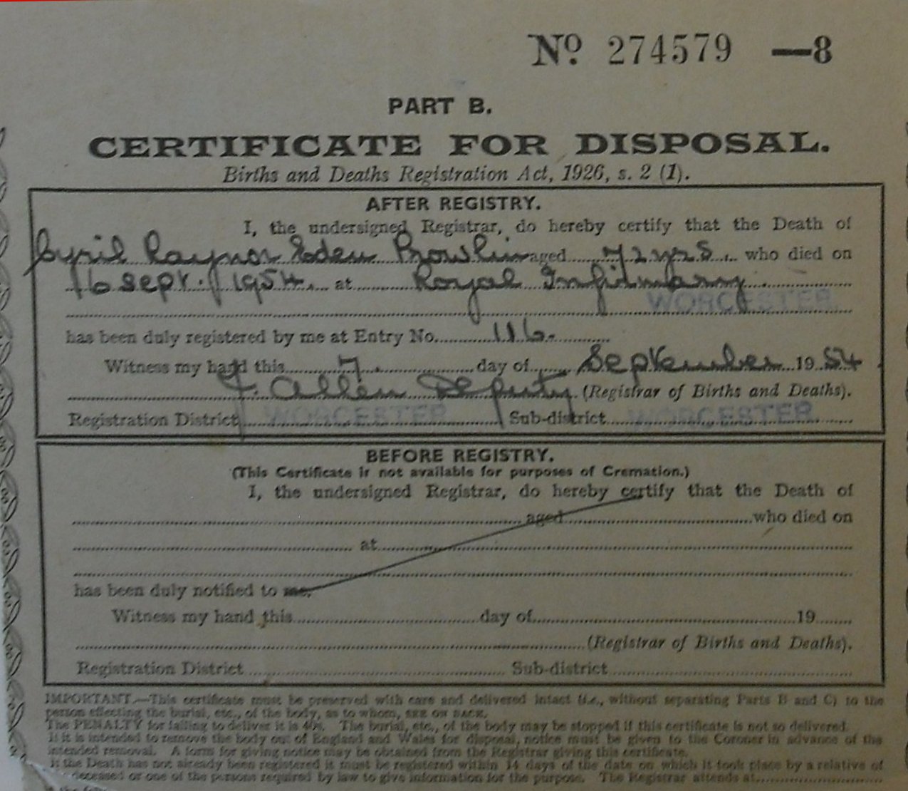 7 September 1954 Cyril Raynor Eden Prowlin Plot 500 Burial Ground