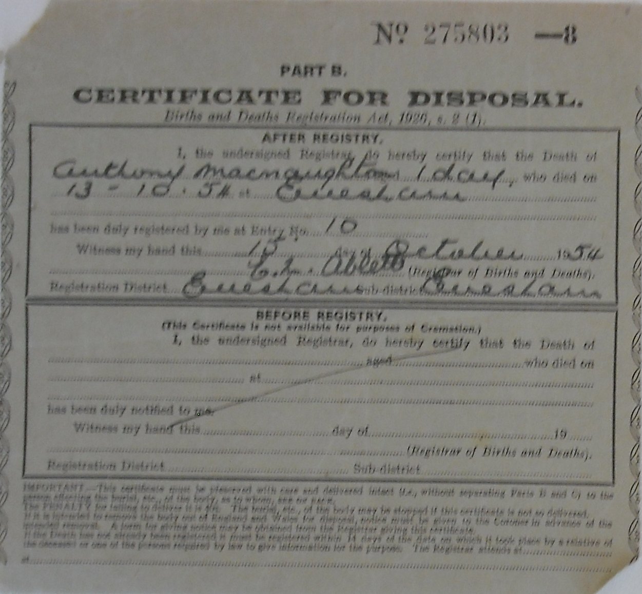 15 October 1954 Anthony Macnaughton Plot 181 Burial Ground