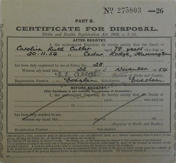 22 November 1954 Caroline Ruth Cutler Plot 134 Burial Ground