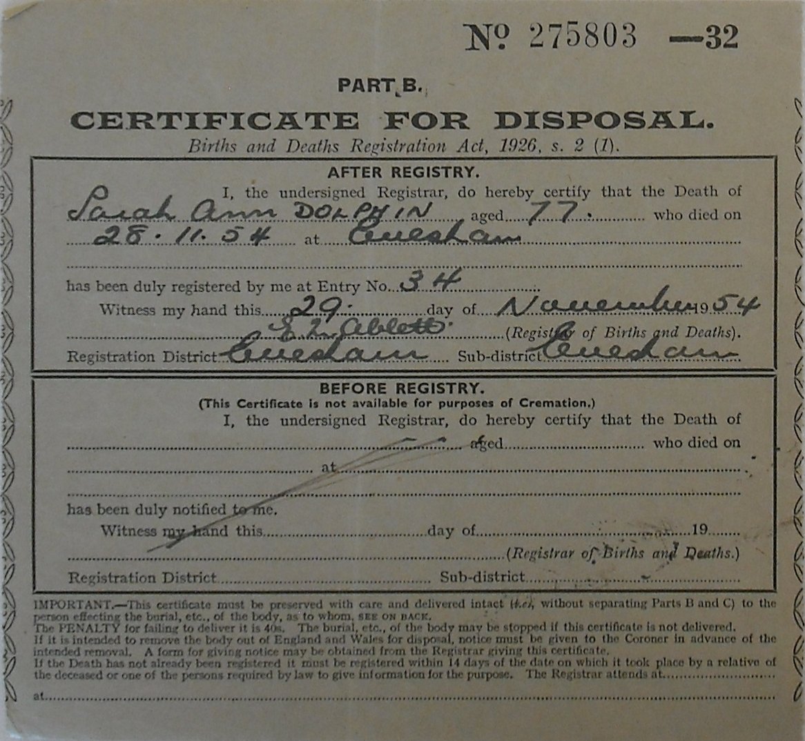 29 November 1954 Sarah Ann Dolphin Plot 543 Burial Ground