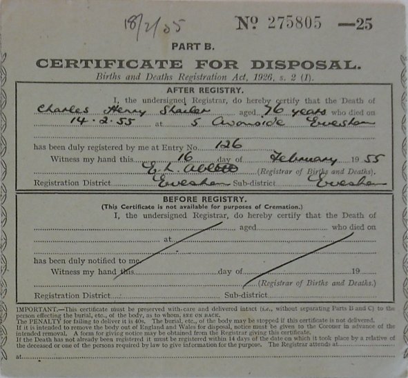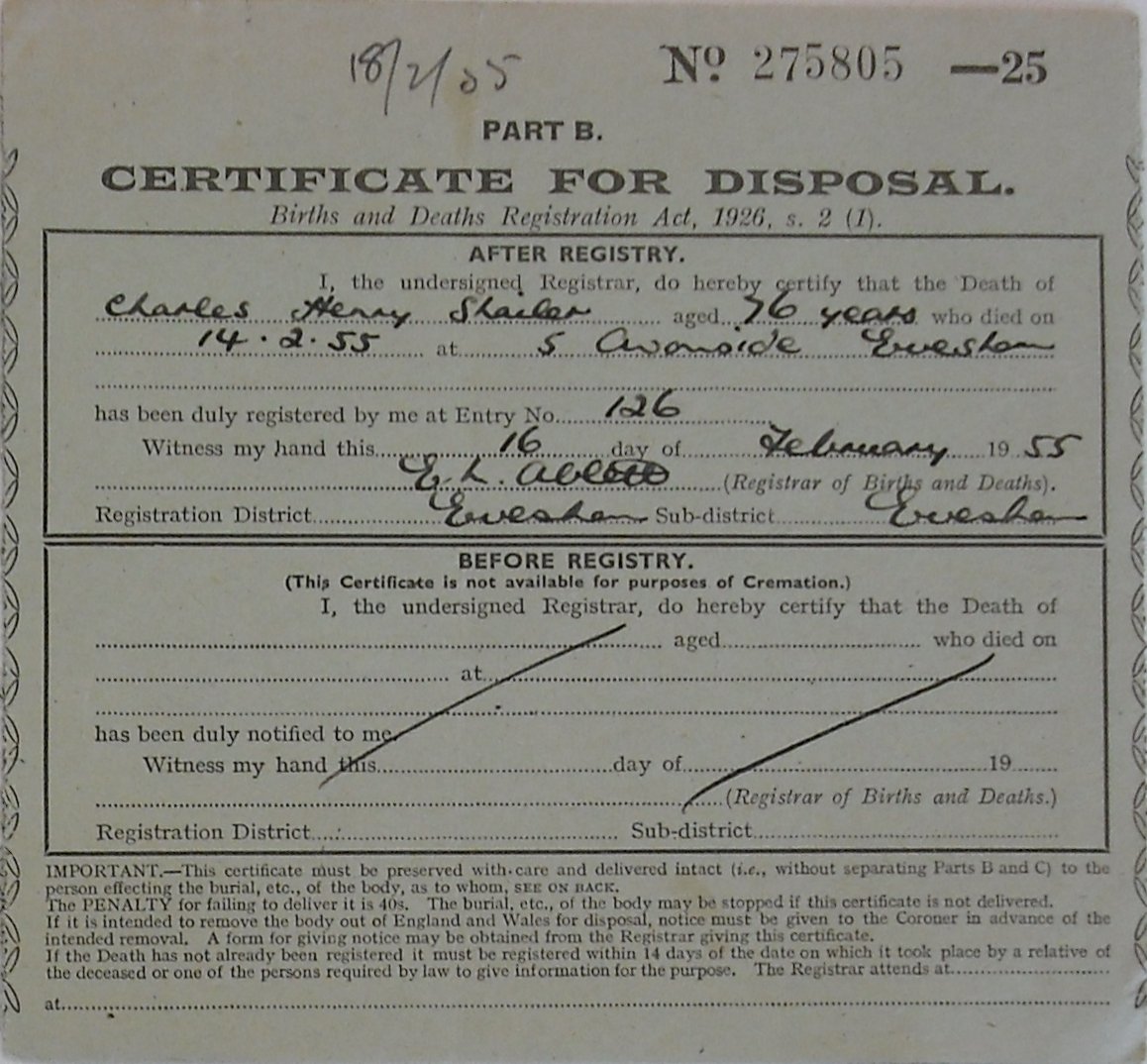 16 February 1955 Charles Henry Shailer Plot 458 Burial Ground