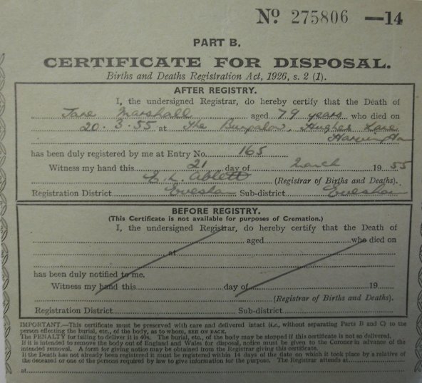 21 March 1955 Jane Marshall Plot 416 Burial Ground