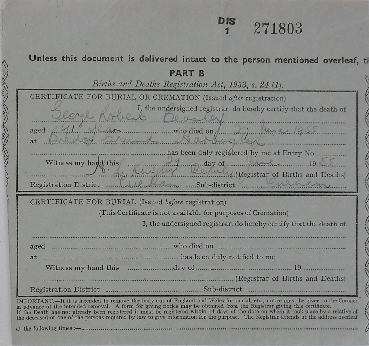29 June 1955 George Robert Beasley Plot 542 Burial Ground