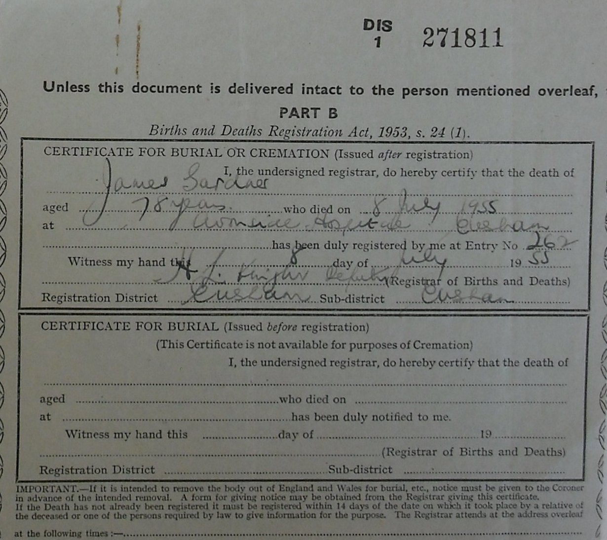 8 July 1955 James Gardner Plot 544 Burial Ground