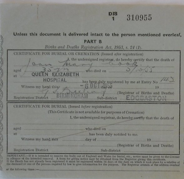 6 October 1955 Joan Mary Cook Plot 499 Burial Ground