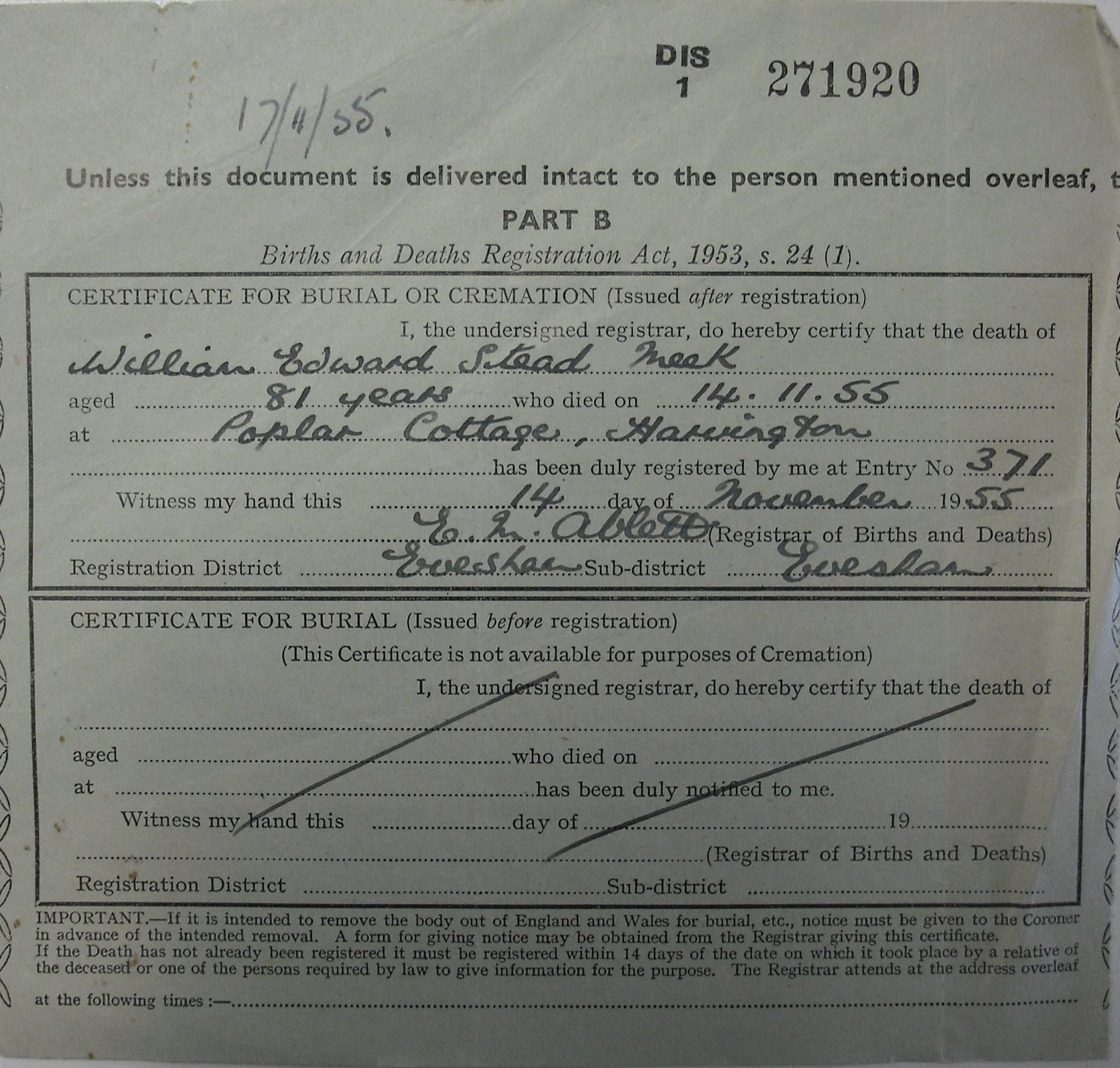 14 November 1955 William Edward Stead Meek Plot 36 Burial Ground