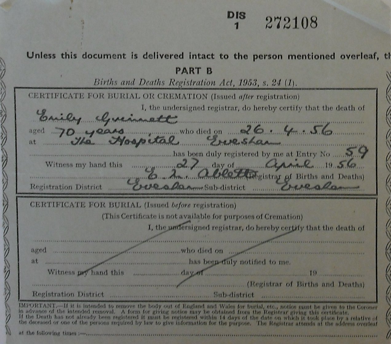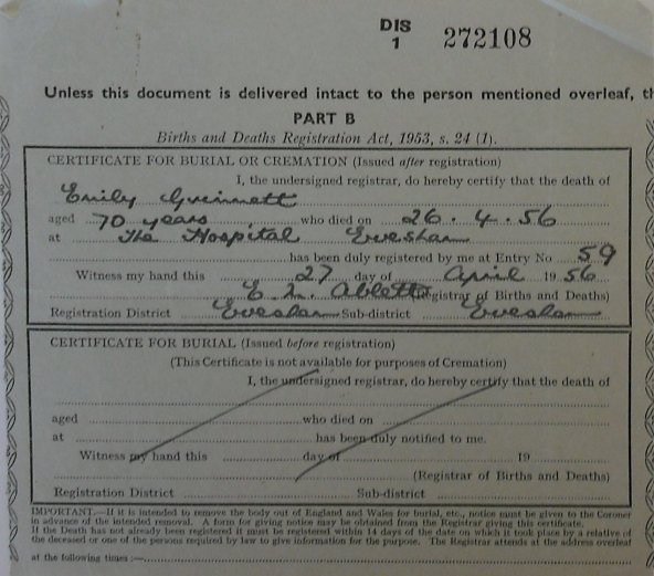 27 April 1956 Emily Grimmitt Plot 415 Burial Ground