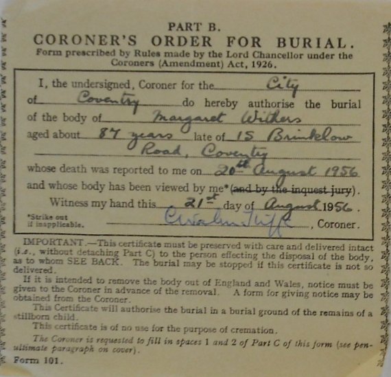 20 August 1956 Margaret Withers Plot 154 Burial Ground