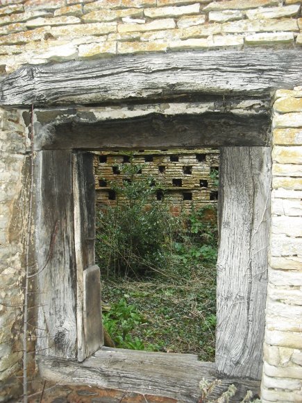 After the church and Manor Farm, one of the oldest buildings in the village is, or rather was, the Dovecote. There is very little documentary information on this Grade 2 listed building and no detailed photographic record has come to light. An arial photograph dated to circa 1960 suggests that the roof was still intact but it has long gone and only three walls now remain with the likelihood that the rest will follow. This little memorial to it has been added along with a description, rough measurements and a reconstructed drawing of its assumed original appearance.