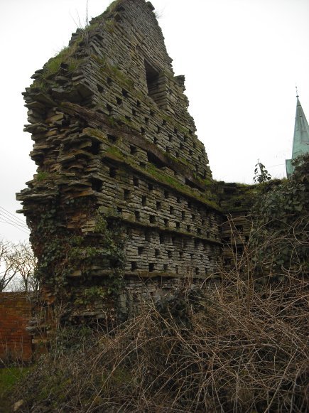On closer inspection of the interior the structure is more complicated. There are the remains of wooden wall plates running across the gables thereby connecting the two wooden wall plates on the top of the side walls. The beams would have been approximately 10 inches square. The interior is lined with roosting shelves in chequered pattern interspersed with perching ledges every second to third row up to the wooden wall plates and beyond, in the case of the gables, to the bottom of the windows. The hole openings are roughly square and open up to the left as the birds enter. The lower holes are blocked up to the third row. This is due to the entry into this country of the brown rat in the 1720-30's, which caused devastation to the dovecotes as the black rat did not attack pigeons whereas the brown rat did. Therefore in many dovecotes older than the above date, the lower holes were blocked, as is the case with Harvington's dovecote. North gable wall: there are 160 nesting holes and six stone perching ledges. East side wall: Partially collapsed but enough to estimate there were approximately 140 nesting holes with five ledges. South gable wall with doorway: There are 136 nesting holes with six stone ledges. West side wall: There appears to have been 143 nesting boxes and five stone ledges on this side although a portion of the lower structure has been repaired in brick. This makes a total of 579 holes although as the first two to three rows are blocked it is difficult to tell the exact number due to debris.