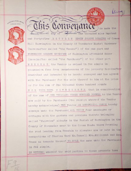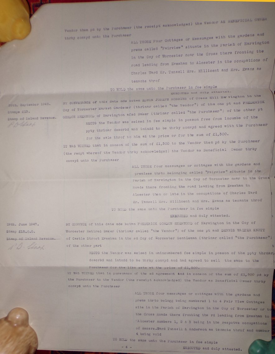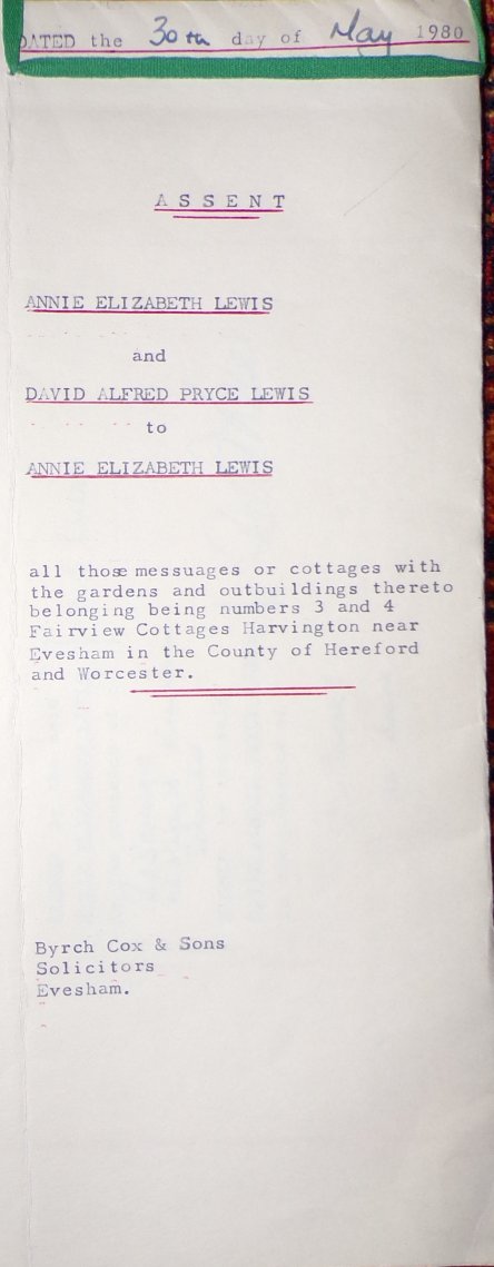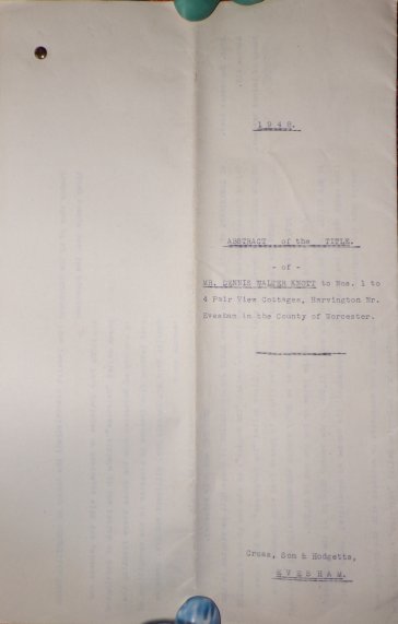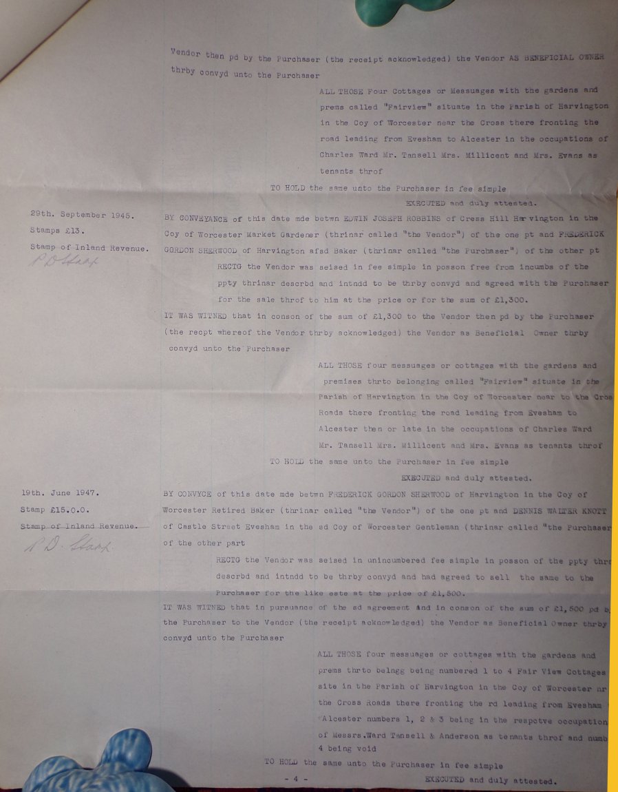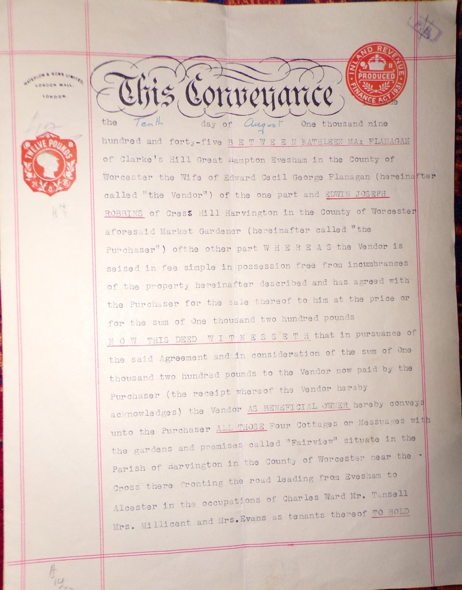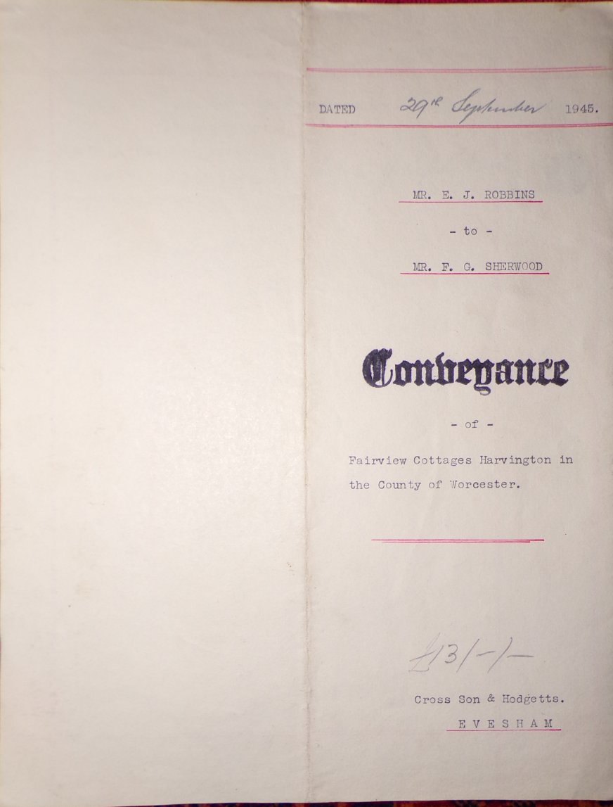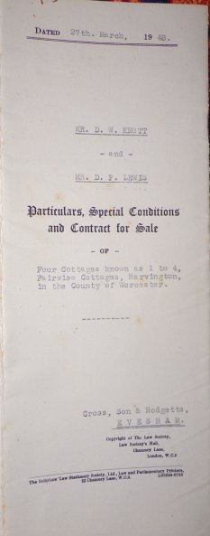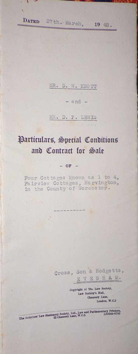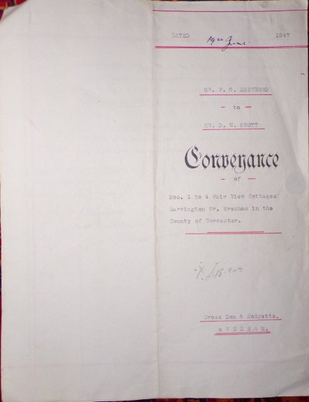 The earliest document (No.1) within the bundle of Deeds is dated 29th September 1876 and is a conveyance relating to the Golden Cross pub, two attached cottages (adjacent to the Golden Cross and now one) and, importantly, a piece of land on the Alcester. It is upon this 'piece of land' that the four Fairview Cottages were eventually built. Then follows forty-four documents which give a detailed history of the cottages, later to become two. The present owners, the Haw's, purchased number four (three and four) in 1995. The present owners Alex and Irene Haw have kindly allowed access to this bundle of deeds.