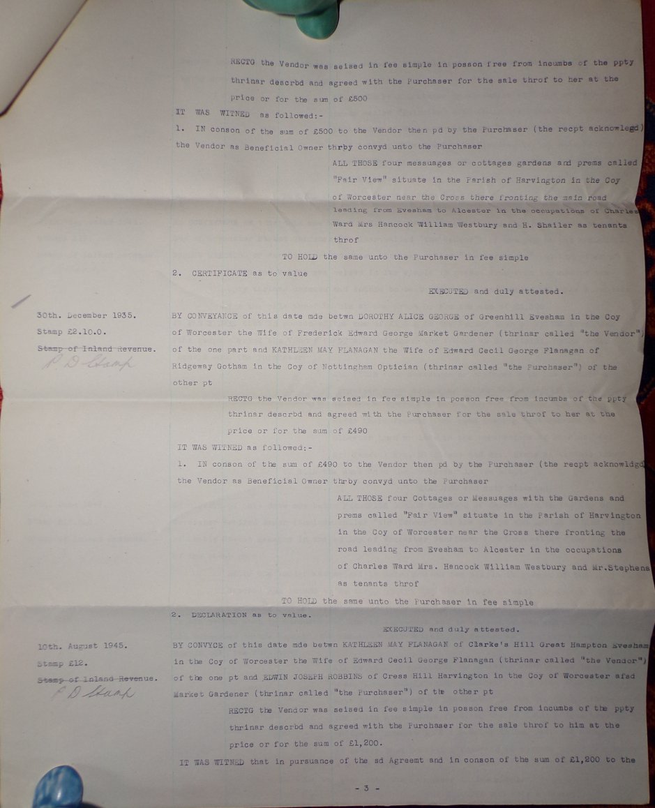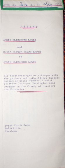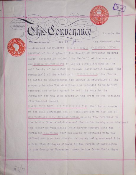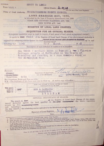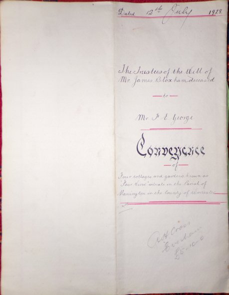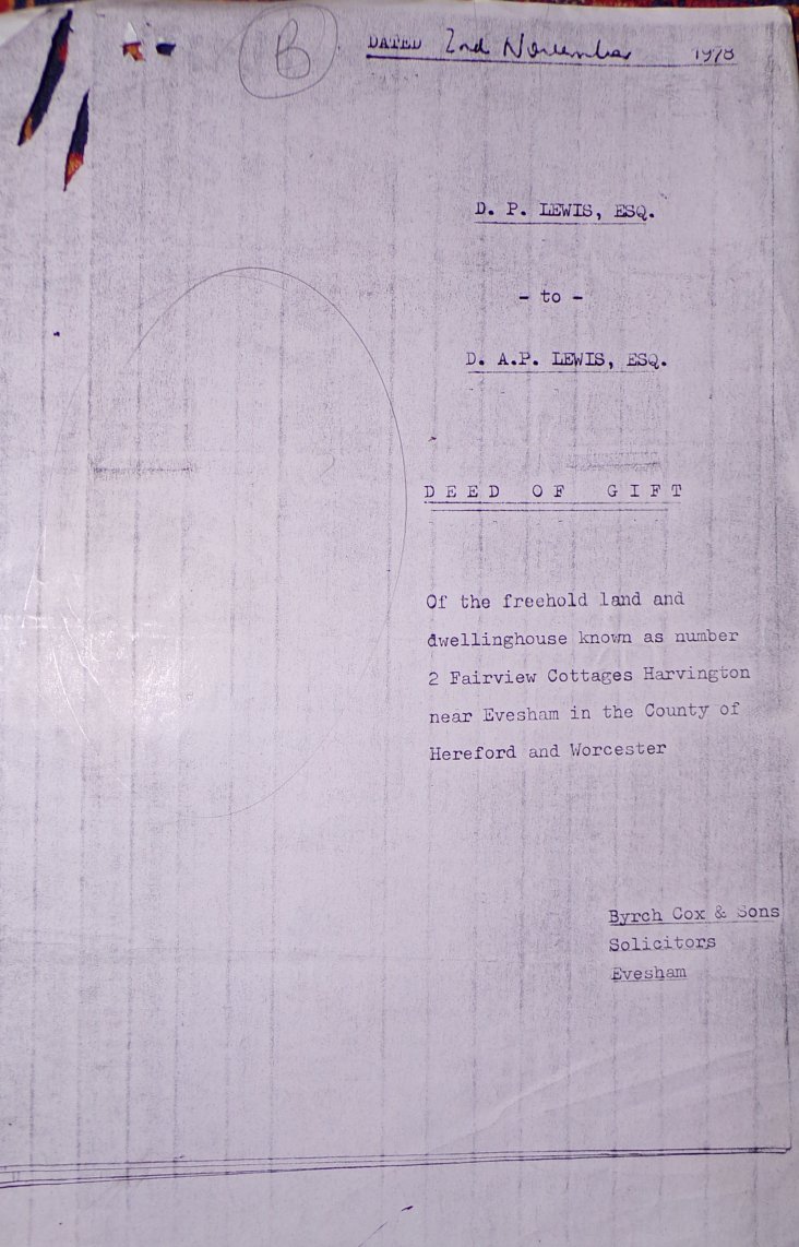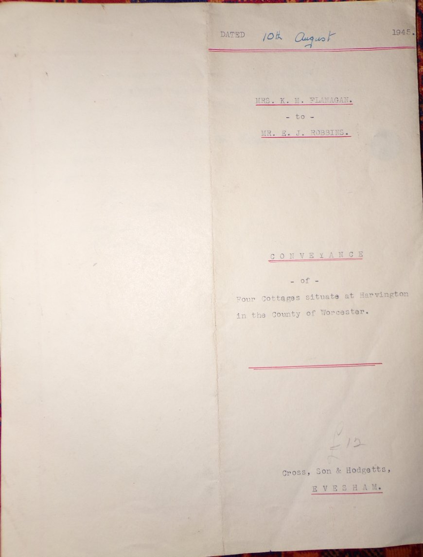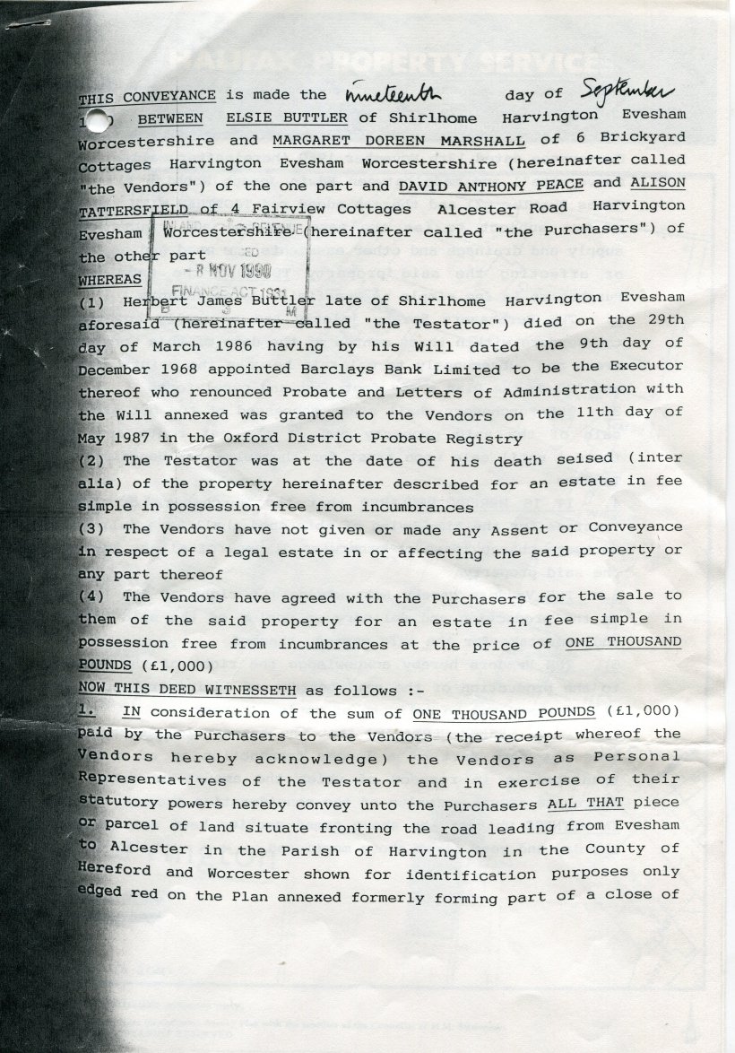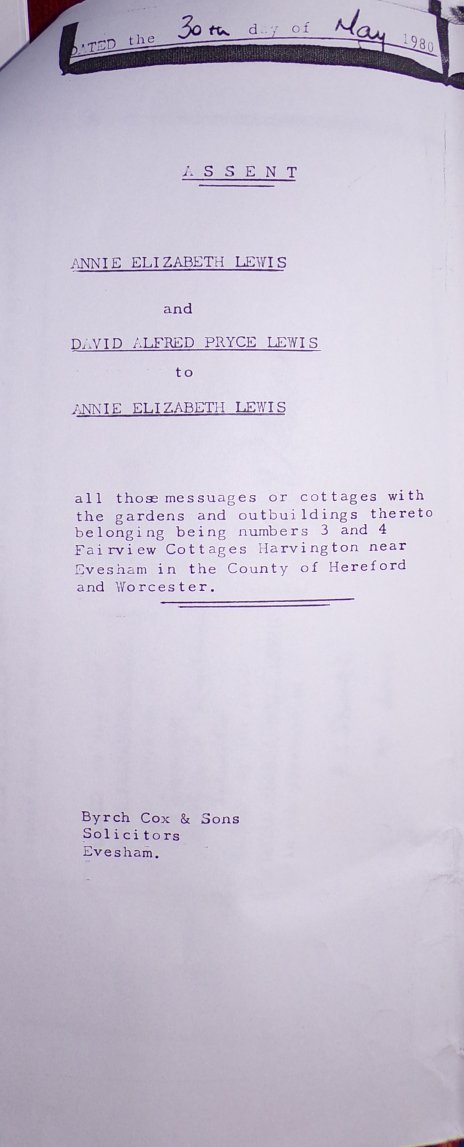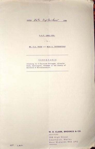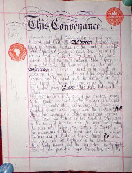 The earliest document (No.1) within the bundle of Deeds is dated 29th September 1876 and is a conveyance relating to the Golden Cross pub, two attached cottages (adjacent to the Golden Cross and now one) and, importantly, a piece of land on the Alcester. It is upon this 'piece of land' that the four Fairview Cottages were eventually built. Then follows forty-four documents which give a detailed history of the cottages, later to become two. The present owners, the Haw's, purchased number four (three and four) in 1995. The present owners Alex and Irene Haw have kindly allowed access to this bundle of deeds.