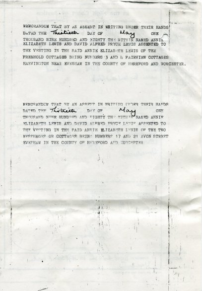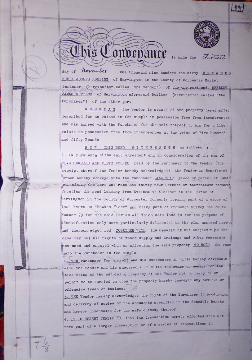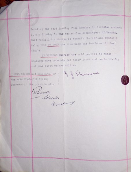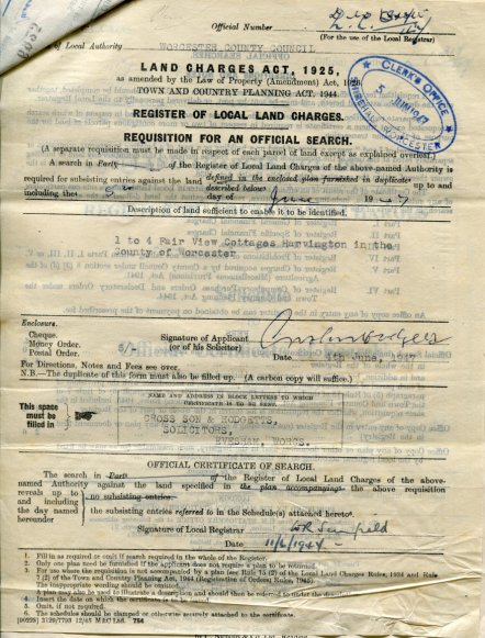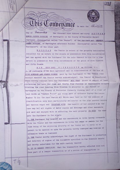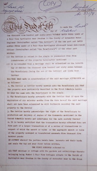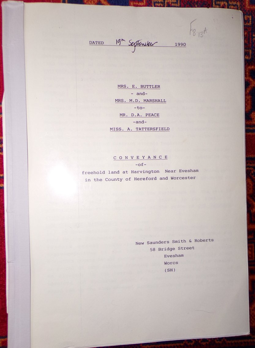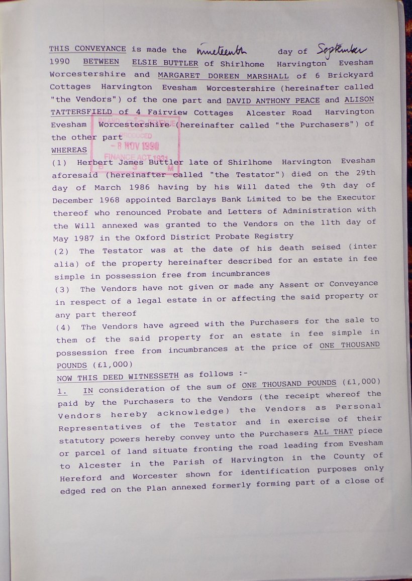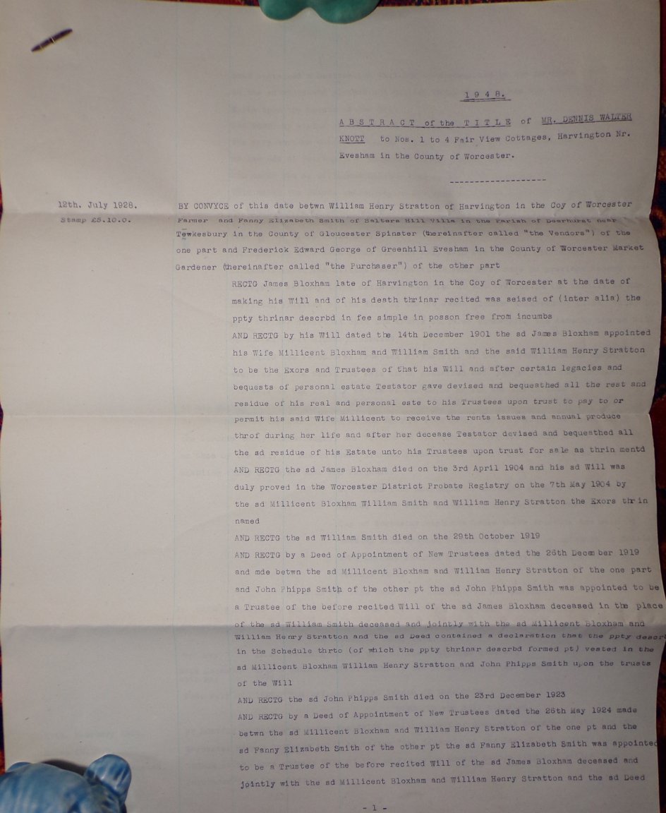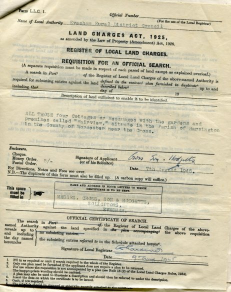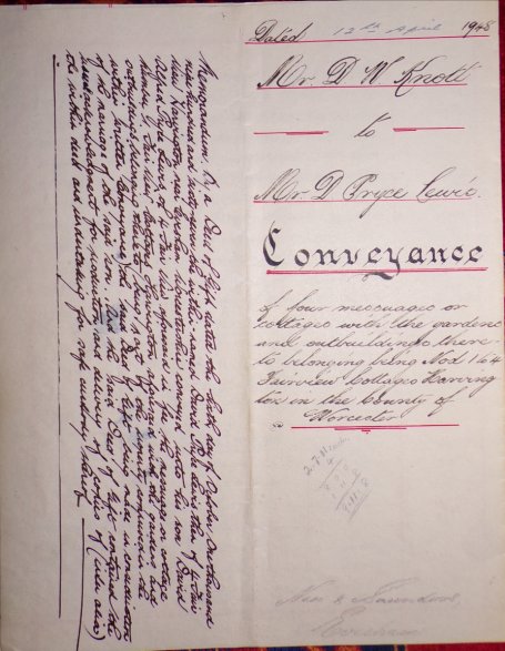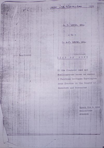 The earliest document (No.1) within the bundle of Deeds is dated 29th September 1876 and is a conveyance relating to the Golden Cross pub, two attached cottages (adjacent to the Golden Cross and now one) and, importantly, a piece of land on the Alcester. It is upon this 'piece of land' that the four Fairview Cottages were eventually built. Then follows forty-four documents which give a detailed history of the cottages, later to become two. The present owners, the Haw's, purchased number four (three and four) in 1995. The present owners Alex and Irene Haw have kindly allowed access to this bundle of deeds.