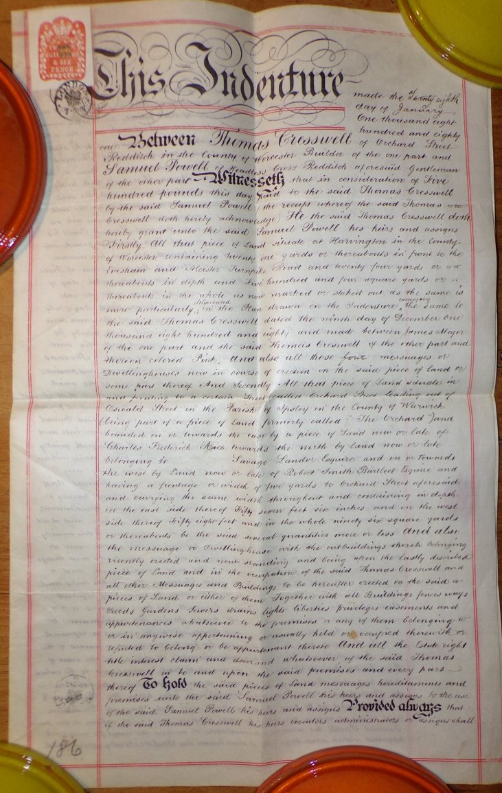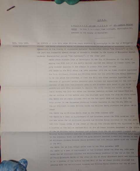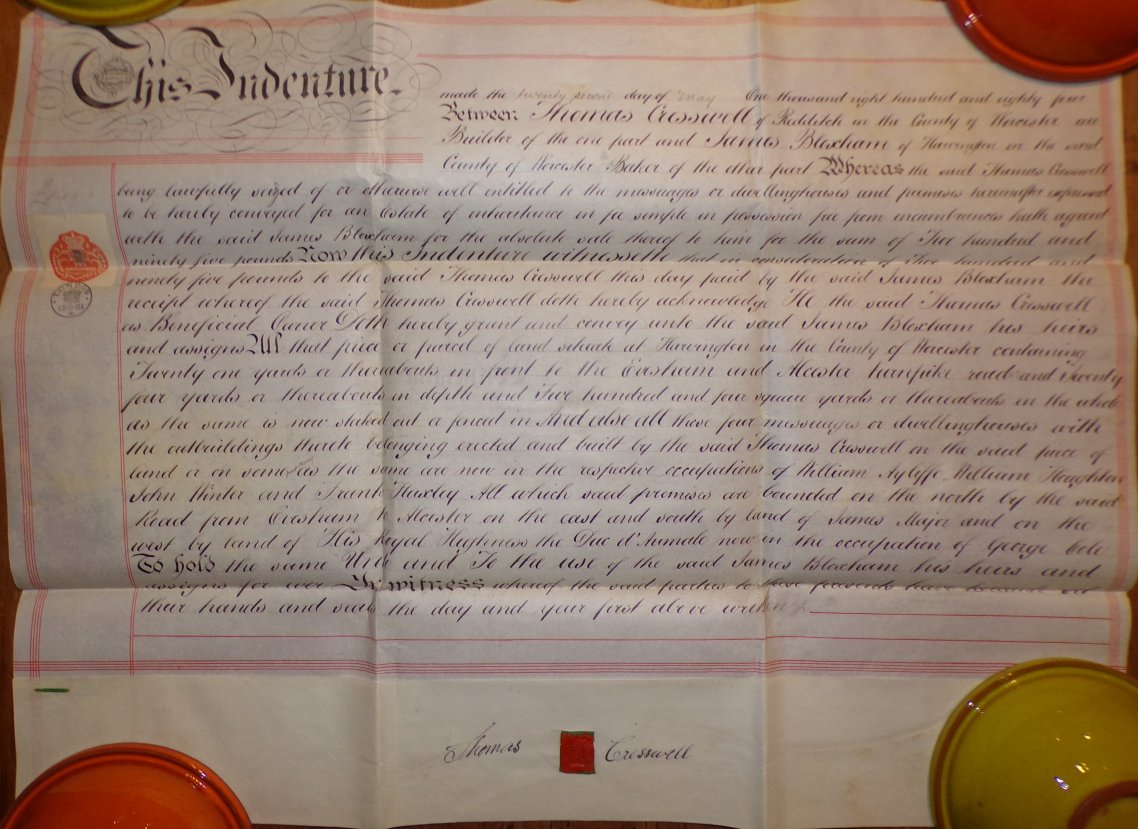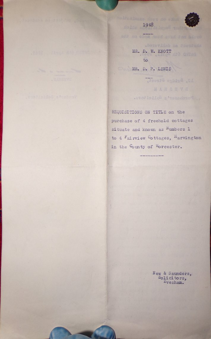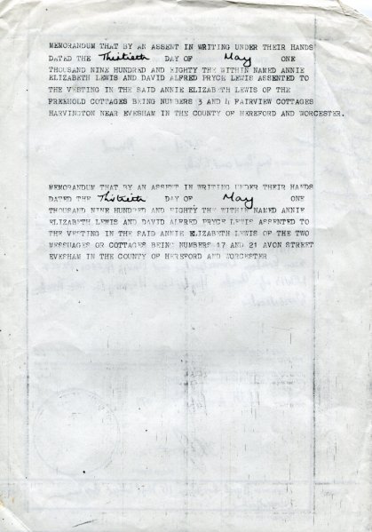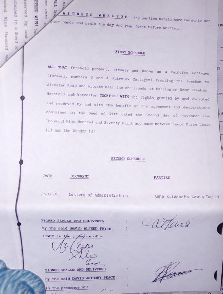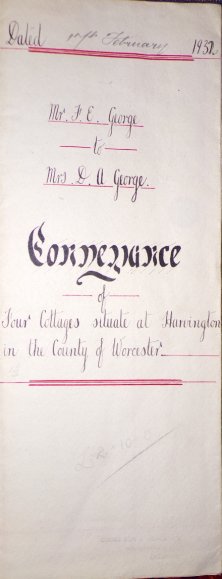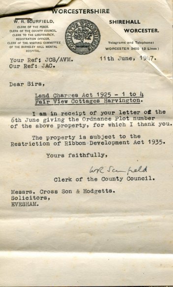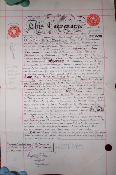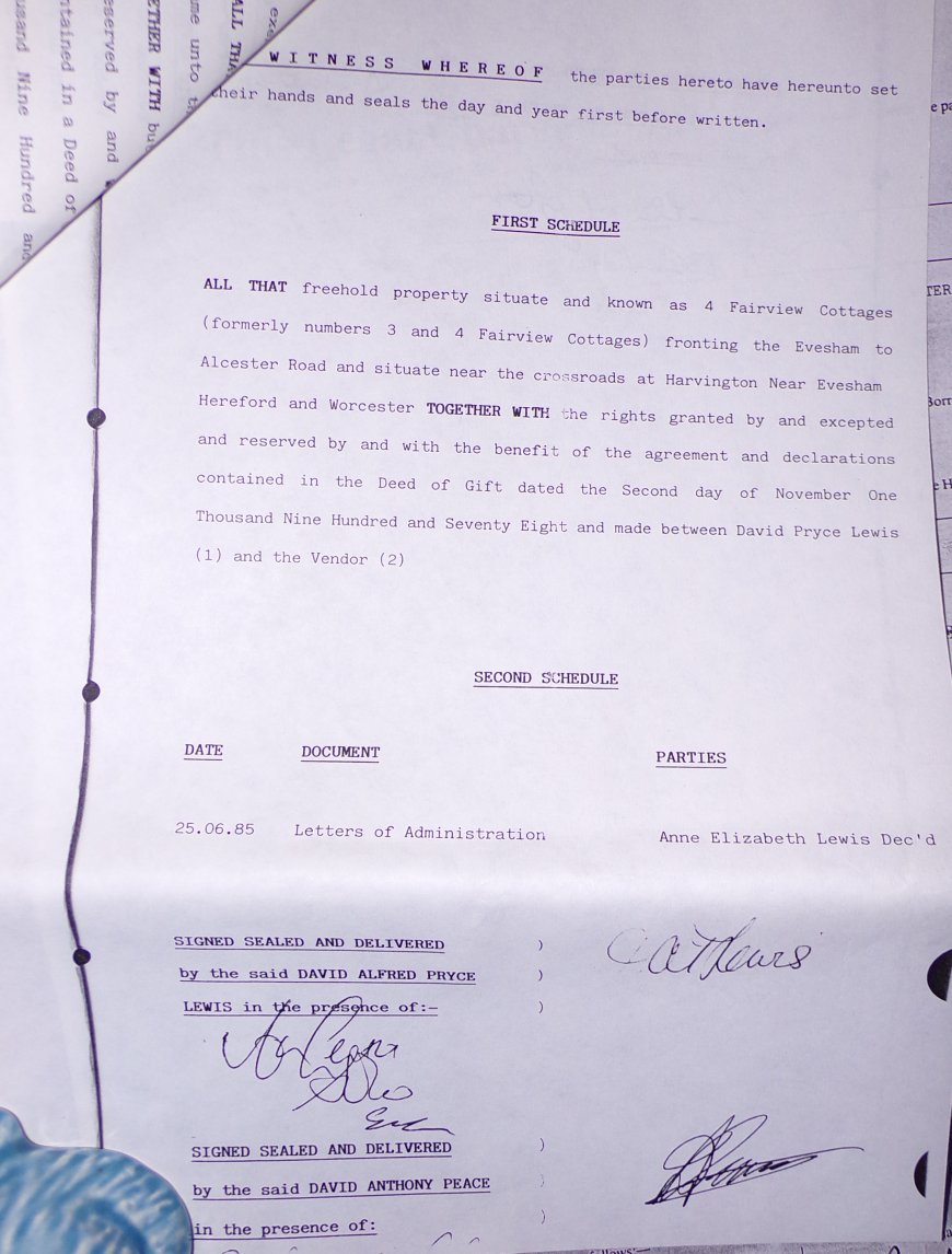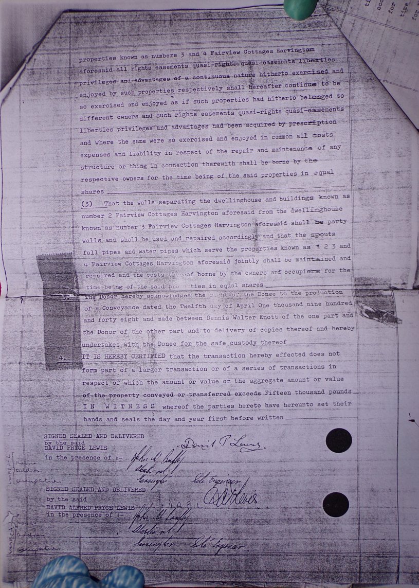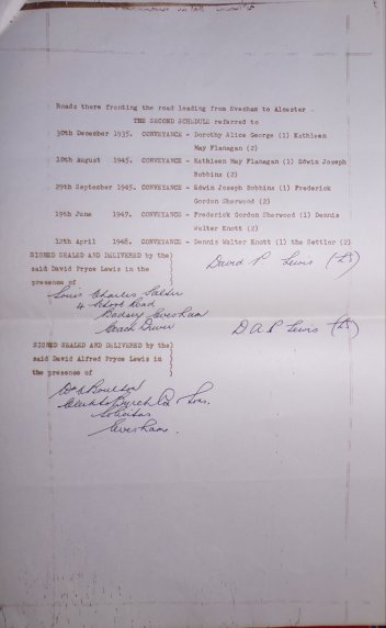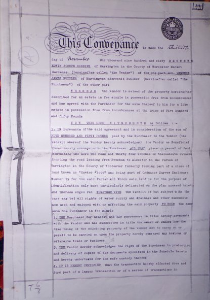 The earliest document (No.1) within the bundle of Deeds is dated 29th September 1876 and is a conveyance relating to the Golden Cross pub, two attached cottages (adjacent to the Golden Cross and now one) and, importantly, a piece of land on the Alcester. It is upon this 'piece of land' that the four Fairview Cottages were eventually built. Then follows forty-four documents which give a detailed history of the cottages, later to become two. The present owners, the Haw's, purchased number four (three and four) in 1995. The present owners Alex and Irene Haw have kindly allowed access to this bundle of deeds.
