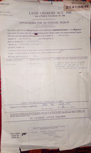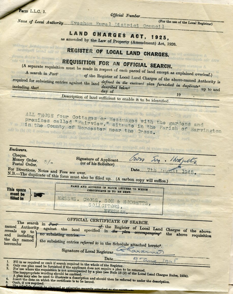 Fairview Deeds 012:         Foolscap page of a land charge dated 7th August 1945.