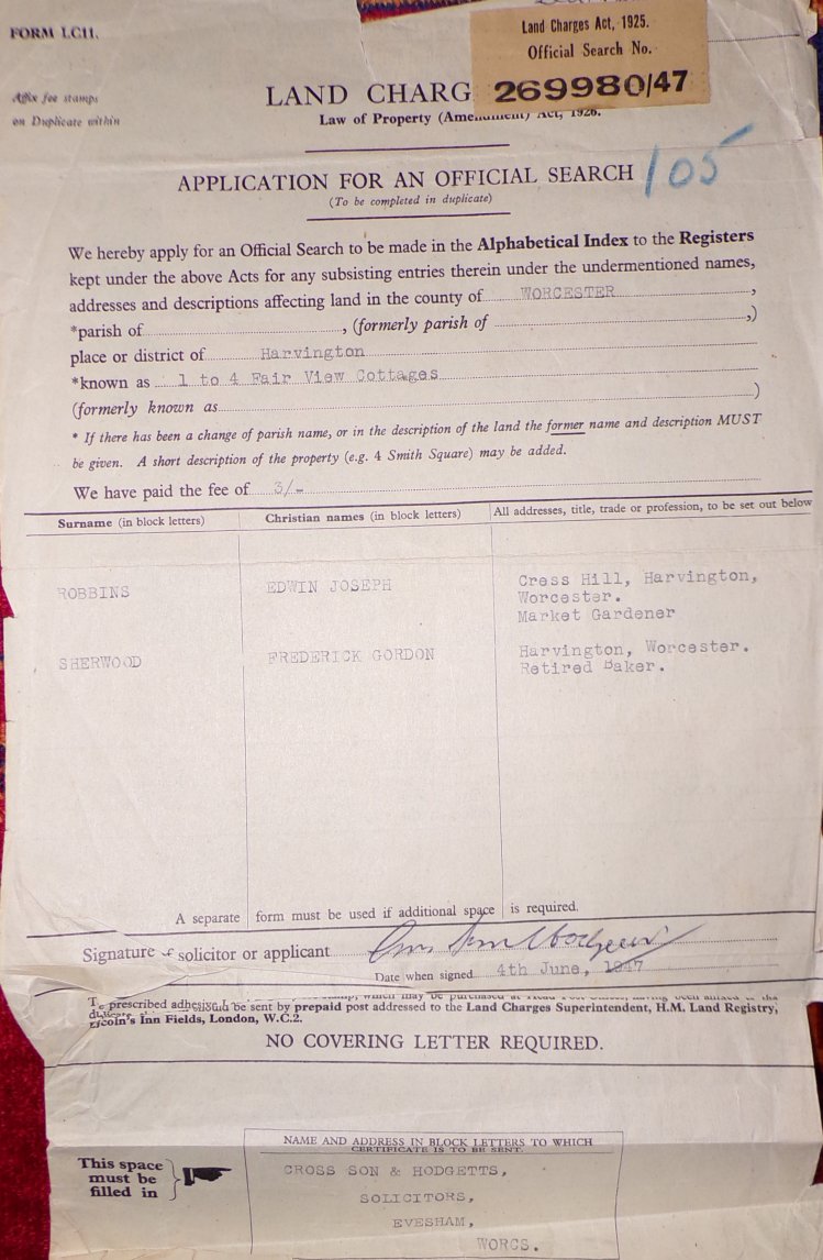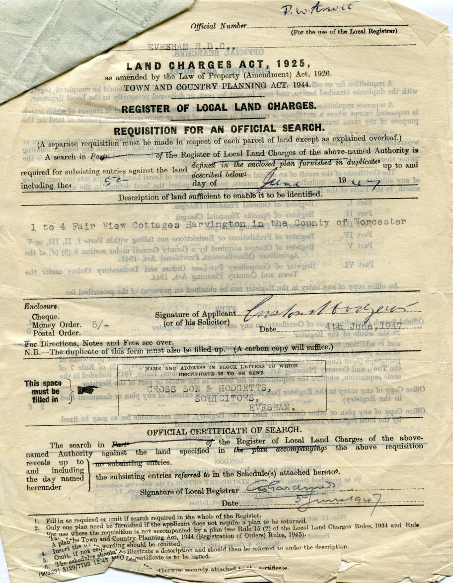Fairview Deeds 017:         Foolscap page of a land charge dated 4th June 1947.