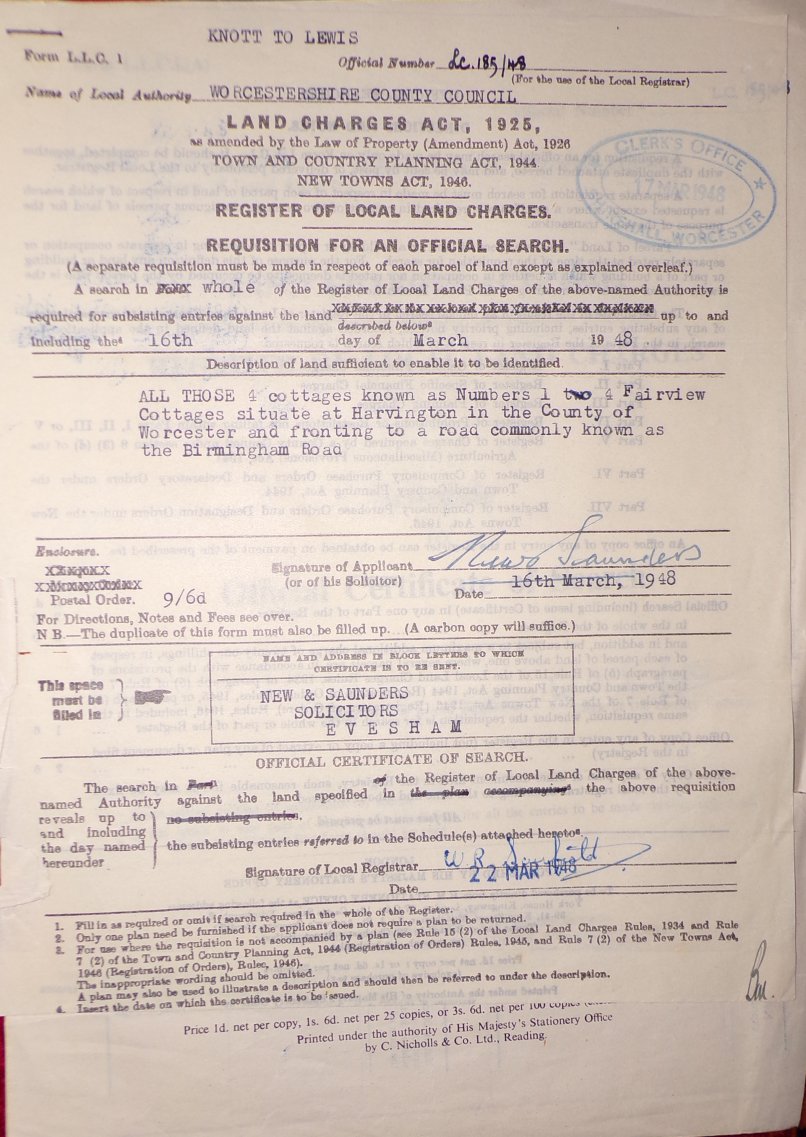 Fairview Deeds 021:         Foolscap page of a land charge dated 22nd March 1948.