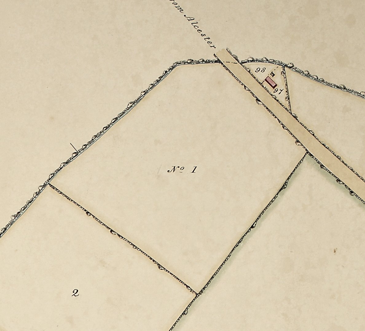1838: a corner field adjacent to the parish boundary ditch and the Evesham/Alcester Road.