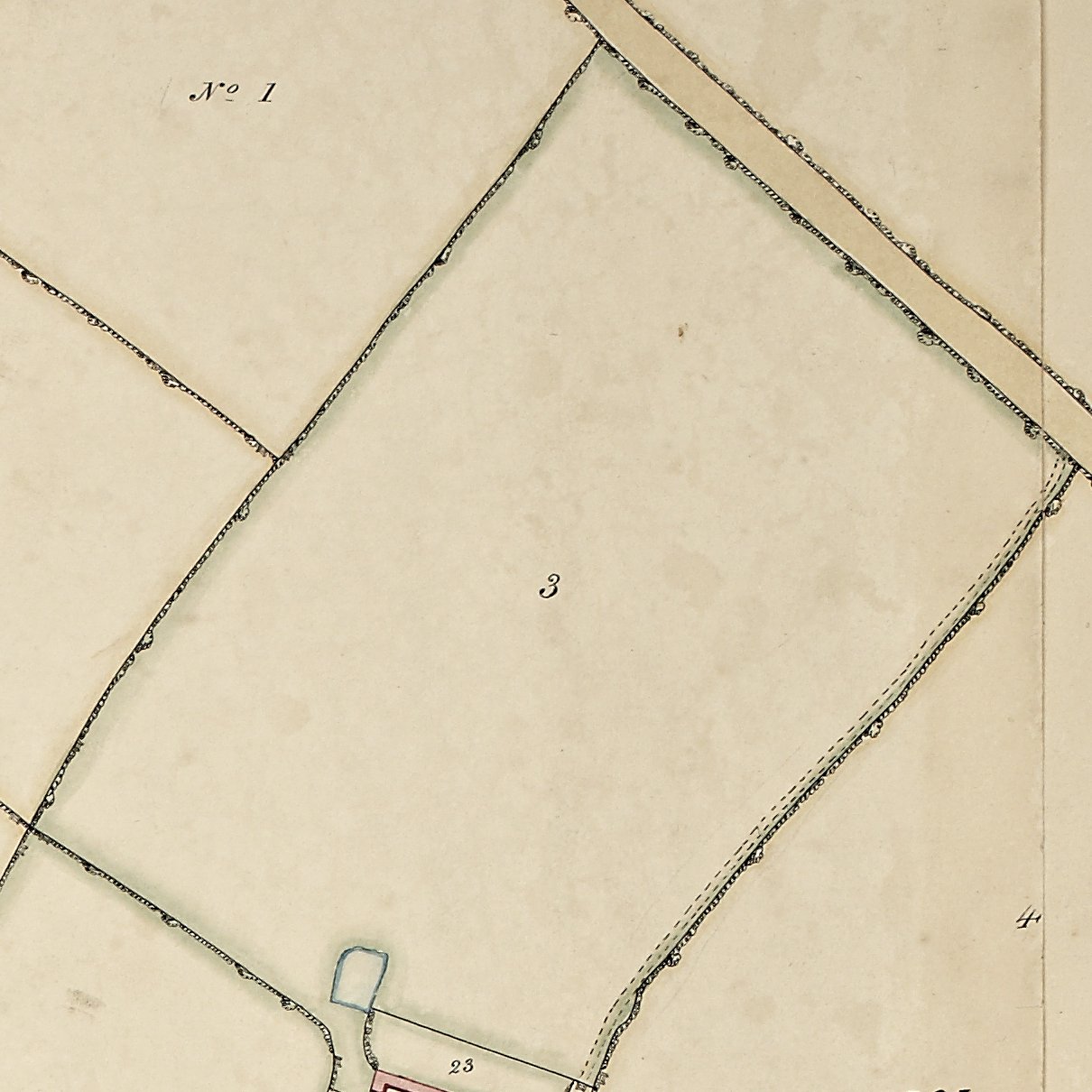 1838: there is a square pool in the north west corner. The track noted in field 6 continues across this field to Hill Farm.