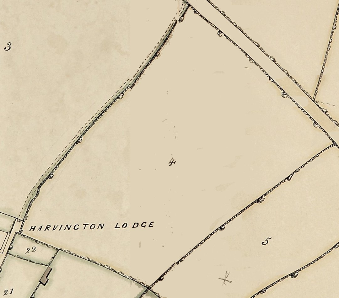 A field stretching from the Evesham/Alcester Road to Harvington Lodge. The track from the road to the lodge runs along the western border and there is a large pool or dip near to the house.