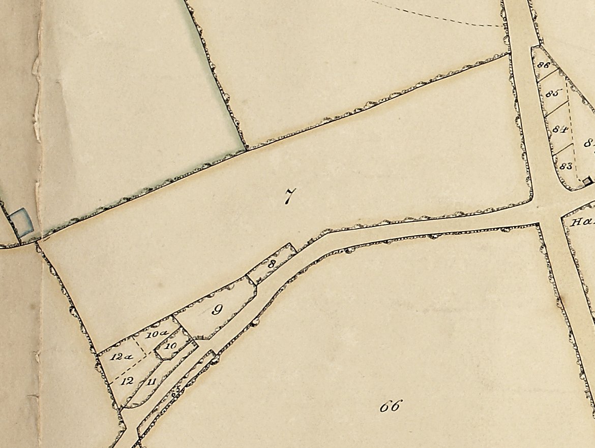 1838: a field running westward from Hughes Lane until ending with two large barns and properties on Grange Lane.