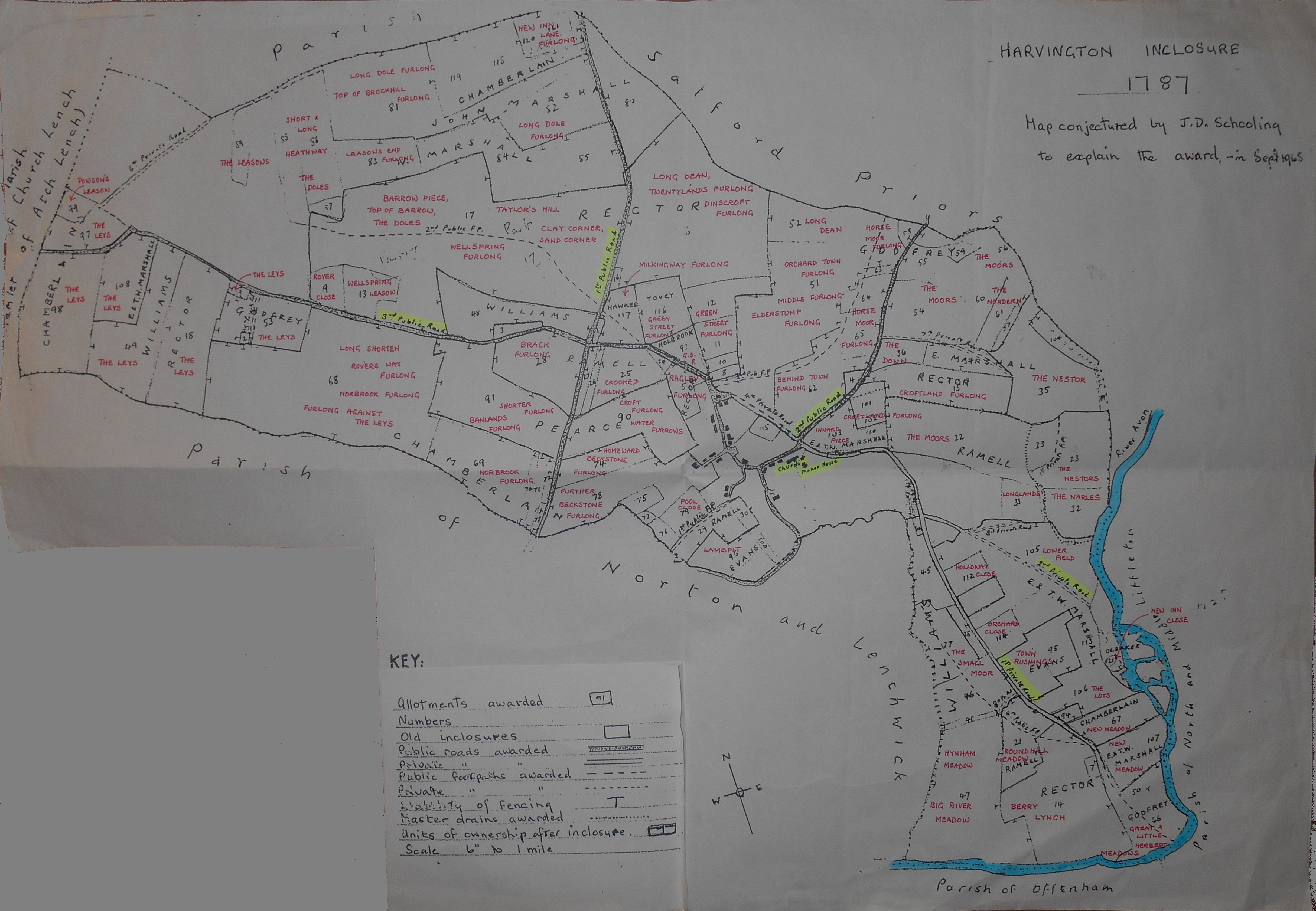 Footpaths do not usually have names so we have to rely upon maps. we are or were blessed with a whole assortment of roads, tracks and paths for folk to move about in the parish. In the old open-field system every furlong would likely to have had a separating bulk or track but once the area was enclosed there was probably a greater need for defined footpaths. 'Rights of Way', some long distance, have become established over many centuries but the Bill of Rights of 1689 is believed to have been the first Act of Parliament to fix where one can go without trespassing. Some footpaths are ancient byways but many only exist within the parish. A number of new ways appear on the OS map of 1884 only to disappear in modern times. Our two main paths extend from the parish of Atch Lench in the north, through the centre of the village and on to the river negotiating the bypasses, etc. and down to the river. Marjory Bailey also records long lost footpaths from the days of the Enclosure Act in 1787.
