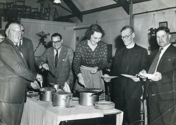 A harvest supper at the village hall. Reg Coley, Ralph Brazier, John Bull, Mrs Bull, Rev Johnson, Ray Cresswell.