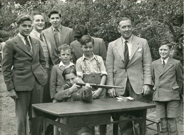 Rifle range at the fete in the Rectory garden: John Bishop, Eric Blake, Cliff Bishop, Reg Coley, Fred Summers, Colin Newman. The two lads are the Hayward brothers.