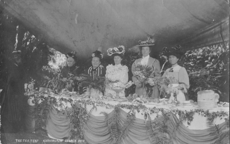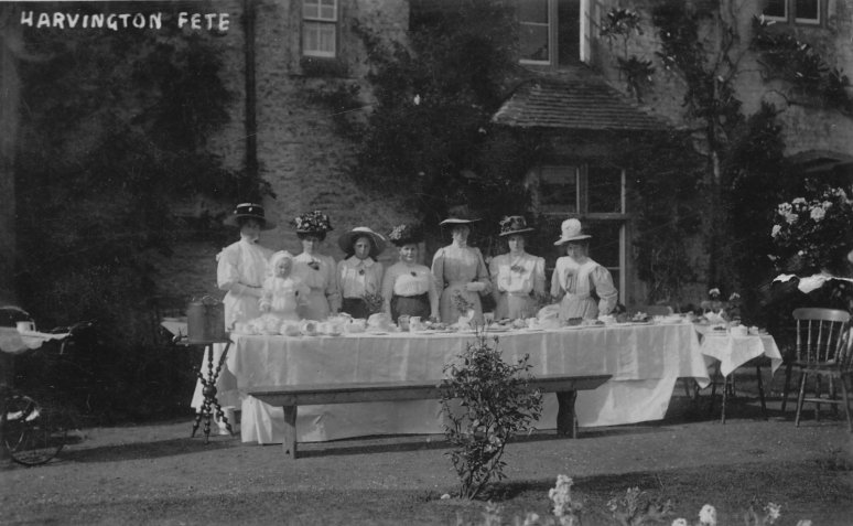 Photograph of a village fete in the grounds of the Rectory. There are two copies of this photograph: written alongside the 1st is "1910 Harvington Village Fete", and below the 2nd is "right to left 1st aunt Nancy Cook, 4th Granny Cook (2nd), 5th aunt Hilda Cook". From the Cook Family Collection.
