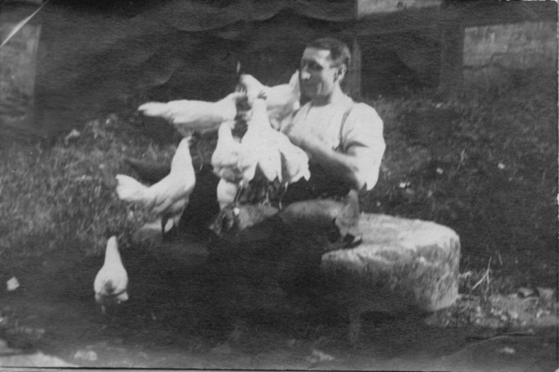 Photograph of Mr Grimmett, the village blacksmith, sitting upon the cider press mill stone. From the Cook Family Collection.